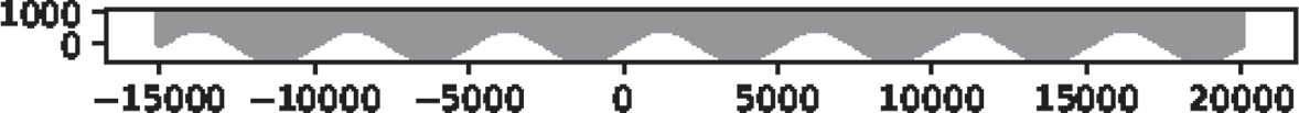 We rotate the gravity to obtain a horizontal upper surface. Formally, we should rotate the left and right boundaries, too. However, this only changes the position in x-direction by a maximum of \(1500 m \cdot \sin (0.5\)\(^{\circ })\)\(\approx 13 m \). This is neglectable compared to the horizontal extent of \(35\, 000 m \). Thus, we simplify the domain with vertical left and right boundaries and a horizontal surface boundary. Moreover, this approach is more flexible because we can simply change the angle \(\alpha \) without changing the domain to generate different experiments. Furthermore, changes between using periodic boundary conditions and the variant with copies of the glacier are easier.