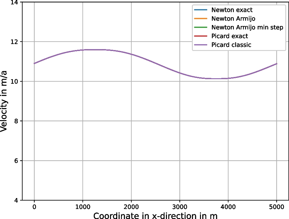 On the Fig. 2 are the surface velocities for all used algorithms restricted to the original glacier \(x\in [0,5000]\). The surface velocities are approximately the same for all our methods. Moreover, the velocities are similar to [22, Figure 6].