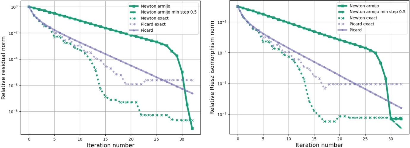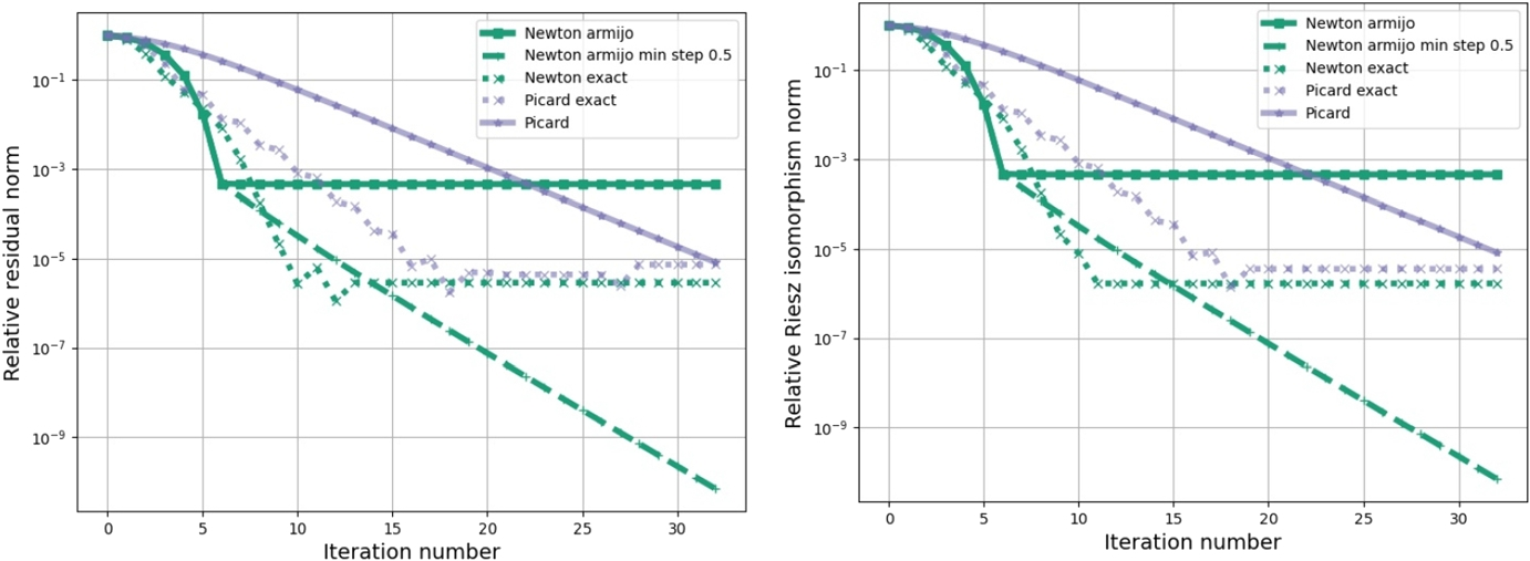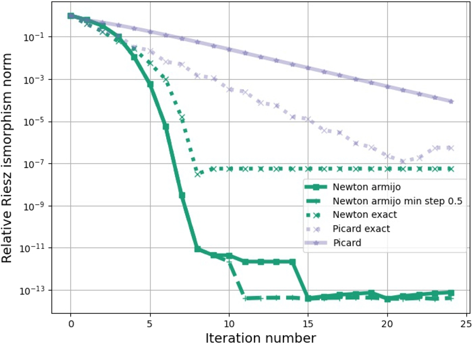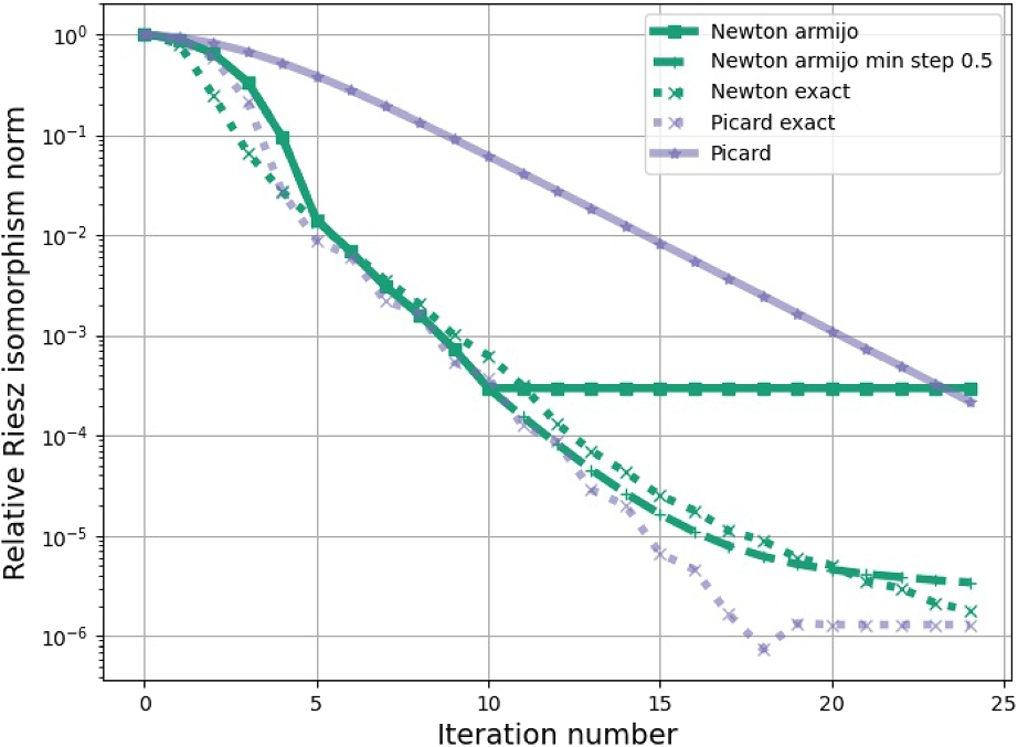 All step size controls use the convex functional, see Definition 2.6, as the minimization term. In Fig. 3, we see the relative norm of the Riesz isomorphism, which compares the actual norm of the Riesz isomorphism of the iteration with the first calculated norm of the Riesz isomorphism, see Definition 6.1. Newton’s method with Armijo step sizes reduces the norm of the Riesz isomorphism compared to the initial norm of the Riesz isomorphism by approximately \(5\cdot 10^3\). Newton’s method with Armijo step sizes starts with a quadratic convergence. After a few iterations, this tends to a linear convergence. Then, the norm of the Riesz isomorphism is constant. The norm of the Riesz isomorphism of the Picard iteration decreases linearly but at a slower rate than Newton’s method with Armijo step sizes. Newton’s method and the Picard iteration with approximately exact step sizes converge similarly fast as Newton’s method with Armijo step sizes.
