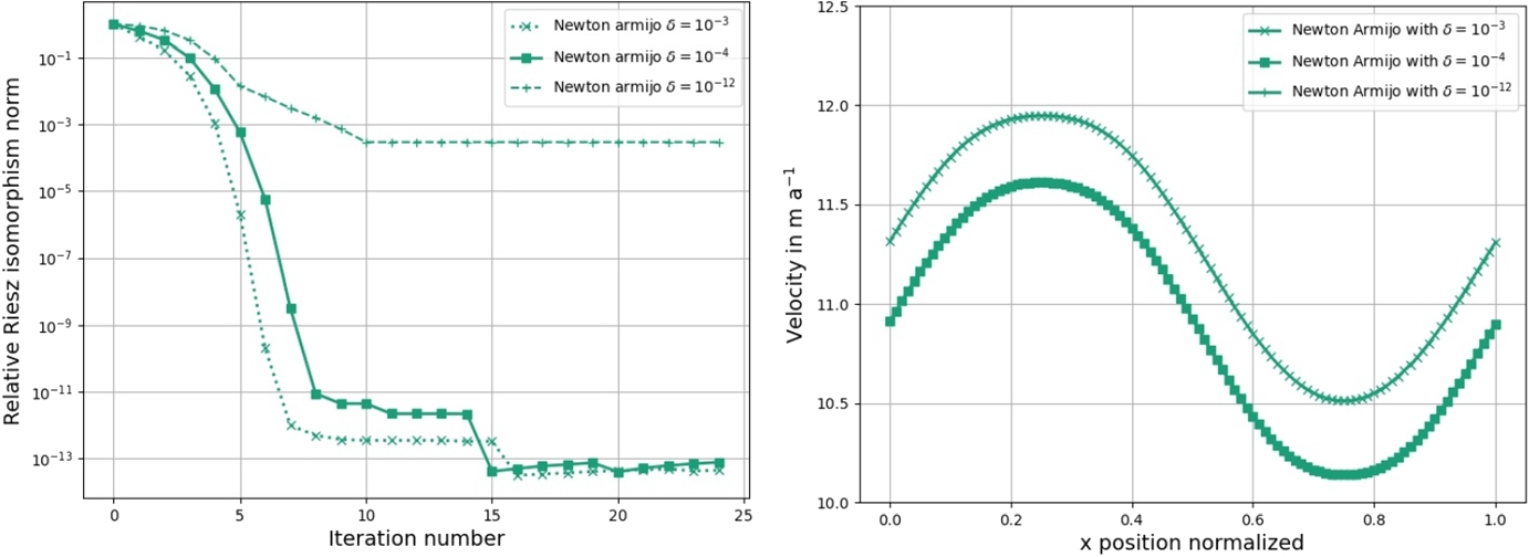 The friction coefficient is \(\tau :=10^7\). Left: the initial guess is the same as in experiment ISMIP-HOM B. Right: the initial guess has the additional term \(\int _{\Gamma _b}\tau \varvec{v_0}\cdot \varvec{\phi }\, ds\)