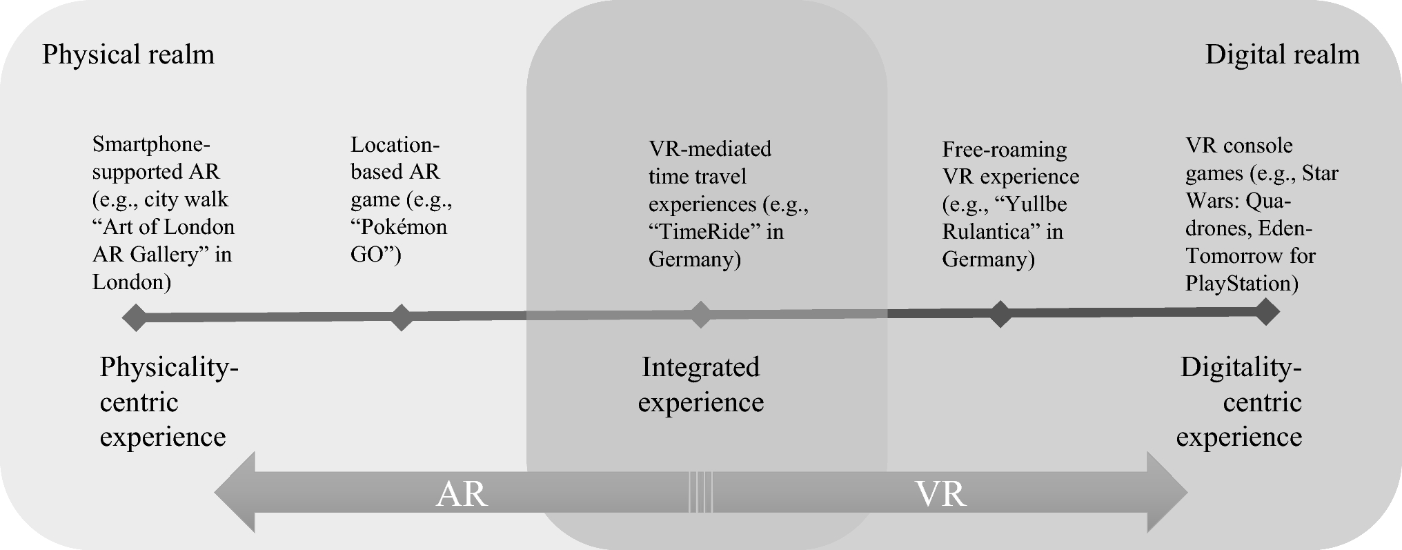 Continuum of physical–digital experiences by type of immersive technology, with examples