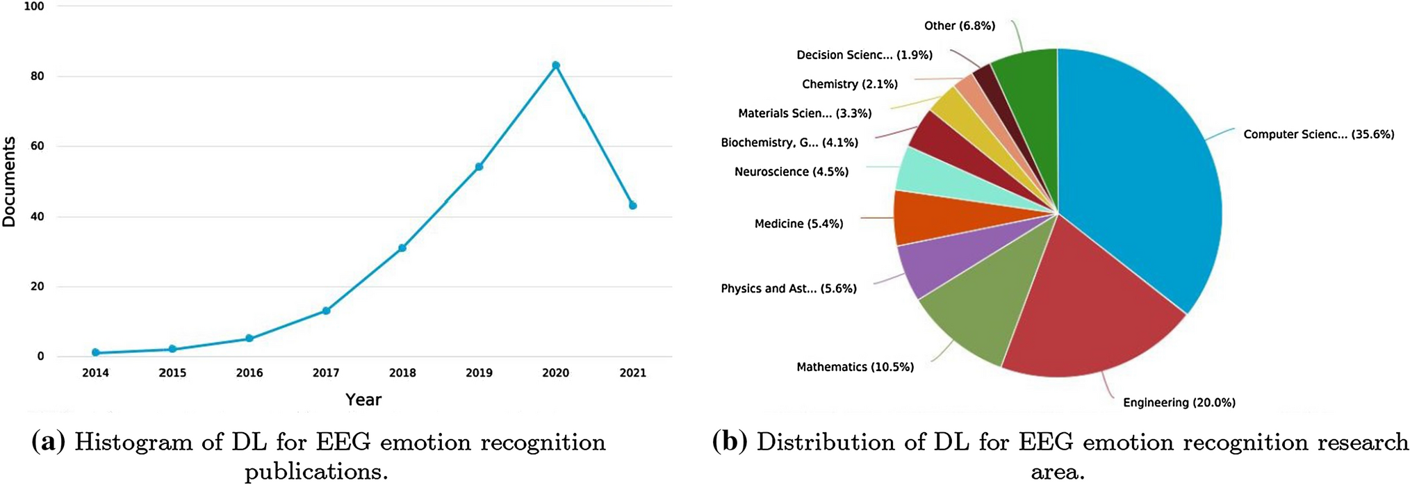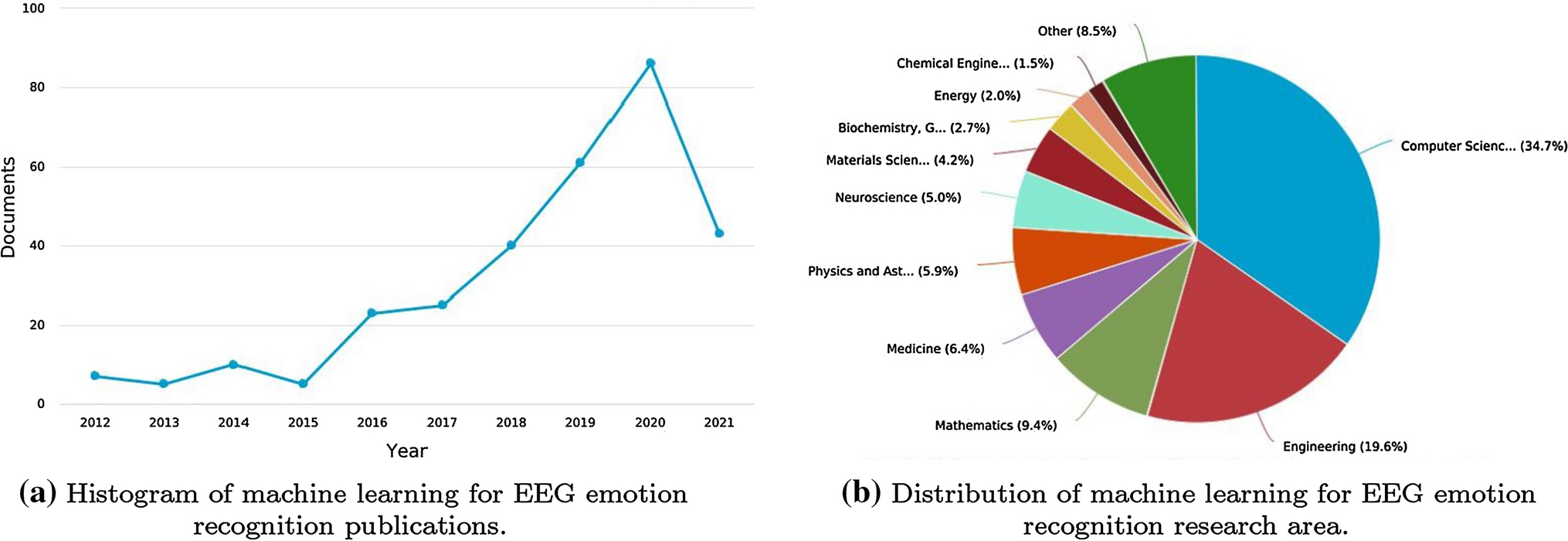 The structure of this paper is as follows: Sect. 1 describes background about brain–computer interface, emotion recognition and application areas of its techniques, different emotional elicitation models. Section 2 introduces the role of each brain area in the formation of emotions, describes EEG frequency bands and EEG characteristics, and investigates the relationship between emotions and EEG data. Section 3 describes the structure of EEG-based human emotion recognition BCI models and provides an overview of EEG signal acquisition, preprocessing, feature extraction, feature reduction and selection, classification, and performance evaluation for emotion recognition problem. Section 4 describes public databases of EEG data for emotional information and presents background information on deep and machine learning approaches. Section 5 introduces related studies that analyze machine and deep learning techniques to recognize human emotional states using EEG-based BCI. Challenges and future research directions will be covered in Sect. 6. Finally, Sect. 7 concludes the research review.