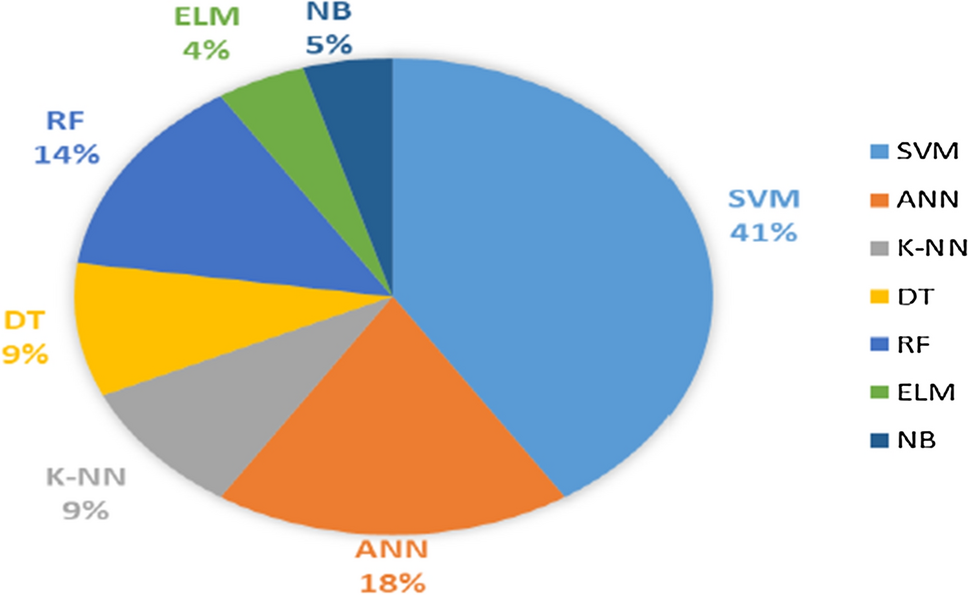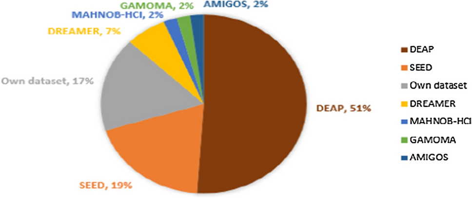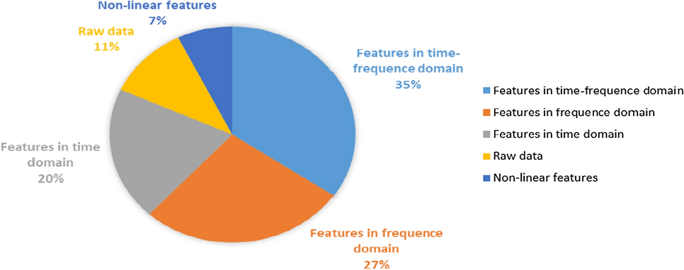 Table 2 shows the feature extraction methods used in the studies covered in this review. Figure 7 presents the usage percentage of the domains of features that have been employed in many of the research papers in this review. The most commonly utilized features are those in the time-frequency domain (35%). Frequency domain features are second (27%), and time domain features are third (20%). Furthermore, raw data (without features) are also utilized (11%). Raw data are utilized as input for deep learning algorithms. Using raw data produces acceptable results, presumably because information is retained and the risk of omitting important signal features associated with emotion is eliminated. Nonlinear features were also utilized (7%).
