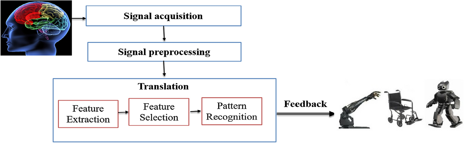 A brain–computer interface (BCI) is a computer-based communication system that analyses signals produced by the central nervous system’s neural activity. It is a very effective communication technology that does not rely on neuromuscular or muscle pathways to accomplish communication, command, and hence action. While thinking with intention, the subject generates brain signals that are converted to commands for an output device. As a result, a new output channel is available to the brain [1, 2]. The basic goal of a BCI is to detect and assess the features of signals in the user’s brain that indicate the user’s intention. These features are then transmitted to an external device that executes to fulfill the user’s desired intention [1]. As depicted in Fig. 1, to achieve this goal, a BCI-based system has four sequential components: signal acquisition, preprocessing, translation, and feedback or device output.