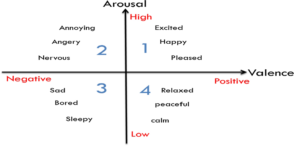 Russell’s 2D emotion model is used most frequently. As shown in Fig. 2, the vertical axis represents the arousal dimension (expressing the emotional intensity of the experience, ranging from low to excitement), and the horizontal axis represents the valence dimension (showing the degree of cheerfulness or joy, ranging from negative to positive). There are four categories of emotions in the arousal-valence coordinate system. The negative emotions are represented on the left side of the coordinate and the positive emotions are shown on the right. The valence axis represents both positive and negative emotions, and the arousal axis varies from inactive to active emotions. Figure 2 shows the first area, which comprises high arousal positive valence (HAPV) emotions which range from pleased to excited. Area 2 comprises high arousal negative valence (HANV) emotions that vary from nervous to annoying. Area 3 comprises low arousal negative valence (LANV) emotions. The last area encompasses low arousal positive valence (LAPV) emotions (calm to relax). As shown in Fig. 2, the first two zones reflect high arousal (active) emotions, whereas the last two zones indicate low arousal (inactive) emotions.