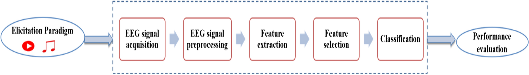 The architecture of an EEG-based BCI system for emotion recognition is shown in Fig. 5. EEG signal acquisition, preprocessing, feature extraction, feature selection, emotion classification, and performance evaluation are distinct processes that will be discussed in the following sections.