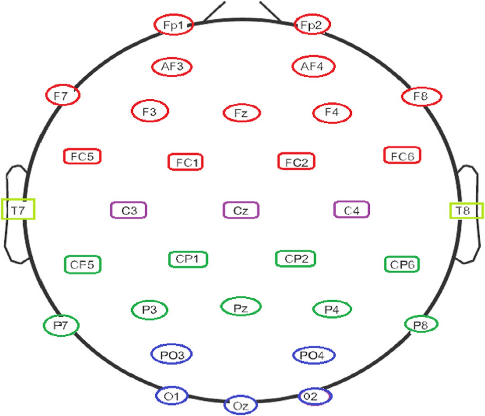 Research objectives differ; therefore, in EEG experiments that focus on emotion recognition, the gathered EEG signals differ as do the number and location of electrodes. The International 10–20 electrode placement system is used in most EEG emotion experiments. The electrode count varies from six to 62. Based on Fig. 6 [8], it was found that EEG electrodes that are linked to emotions were mostly distributed in the frontal lobe (red), the parietal lobe (green), the occipital lobe (blue), the temporal lobe (yellow), and in the central area (squares). The front polar, anterior frontal, frontal, front central, temporal, parietal, and occipital regions of the brain are abbreviated FP, AF, F, FC, T, P, and O, respectively. The left hemisphere is indicated by an odd number suffix, and the right hemisphere is indicated by an even number suffix. These areas match the physiological basis of emotion creation precisely. The extracted feature dimension can be lowered significantly by adjusting the electrode distribution. Calculation complexity can be reduced, making the experiment simpler and easier to carry out.
