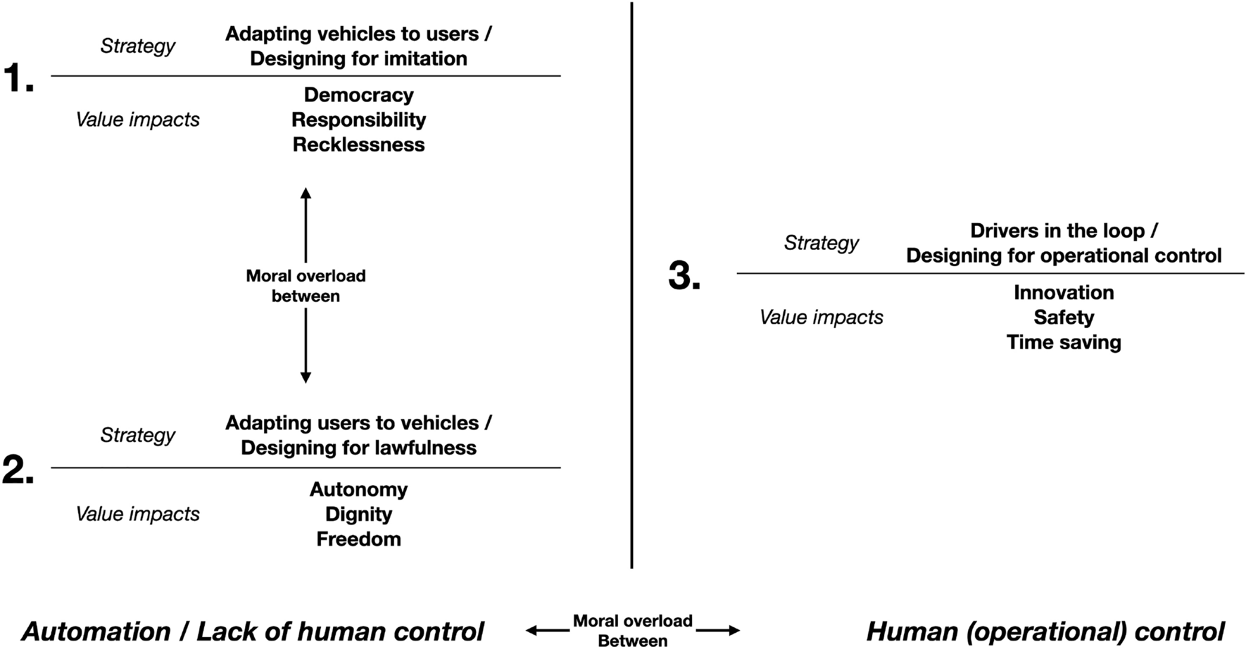 We further suggest that these two strategies can be grouped under one horn of a more fundamental control dilemma, the one between full and partial automation. The full automation horn of this dilemma is the one on which strategy 1 and 2 are grounded (see Fig. 1). They both suffer from ethical issues that are ultimately due to a reduction or shift of moral control, either by drivers (or users) on their vehicles or by some VRUs on their own behaviour. The latter horn consists in strategy 3, which brings back (some) human control to drivers (and, indirectly, VRUs), but it does so in the form of direct, operational control, thereby resulting in safety concerns and a suboptimal state of technological slowdown. More importantly for our argument, this operational control may not amount to that moral control which partly constitutes human autonomy and ground moral responsibility, which in the rest of the paper we will call: Meaningful Human Control.
