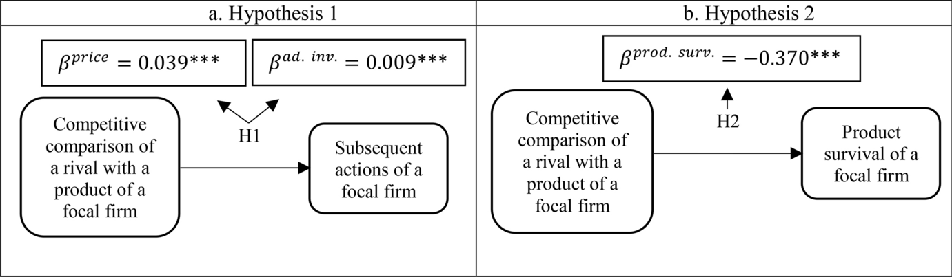 To overcome this problem that derives from considering all products traded in the same segment as direct competitors, we focus on the concept of competitive comparison, which is defined by Kim and Tsai as “the comparison between a focal firm and a target company in a given product market” (2012, p. 115). This tool is ideal for analyzing the competition for two reasons: (1) the comparison can occur in any of the multiple dimensions that define the product space, and (2) it is in tune with the competitive dynamics literature because it admits the asymmetric nature of the subjective evaluation of competitors. To date, Kim and Tsai (2012) have argued that company “X” publicly compares its product with the product of firm “Y” because it seeks to improve its image in the eyes of buyers. Building on this premise, we argue that this circumstance will encourage “X” to take action against the said target to confirm its comparison, which should reduce the commercial longevity of “Y’s” product in the market. The work of Kim and Tsai (2012), which employs a cross-sectional perspective over a year, finds that the competitive comparison of a focal firm “X” with a target firm “Y” increases the former firm’s sales relative to the latter firm’s sales. However, two limitations require emphasis. First, it does not use a longitudinal database that accounts for changes in competitive comparisons between firms resulting from the exchange of actions and responses. Second, it does not consider the potential reaction from the company whose product has been identified as a comparison target.