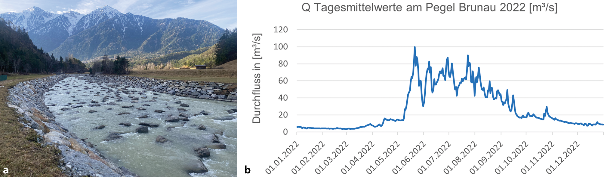 Charakteristisch für die Ötztaler Ache im Bereich des Wehrs Brunau sind niedrige Abflüsse von Oktober bis April mit einem minimalen gemittelten Durchfluss von 3,3 m3/s (Februar 2022, vgl. Abb. 2b). Ab Mai steigen die Abflüsse sprunghaft an und bleiben bis in den September hoch. Der größte Durchfluss im Jahr 2022 wurde im Mai verzeichnet. Das Mittelwasser liegt bei 32.1 m³/s und das HQ100 bei 415 m³/s (Thonhauser et al. 2021). Die stark gletschergeprägte Ötztaler Ache ist, bedingt durch ihr alpines Einzugsgebiet, bekannt für ihre ganzjährig niedrigen Wassertemperaturen, welche im Mittel kaum über 9 °C in den wärmsten Monaten hinausgehen (Erhart 2013).