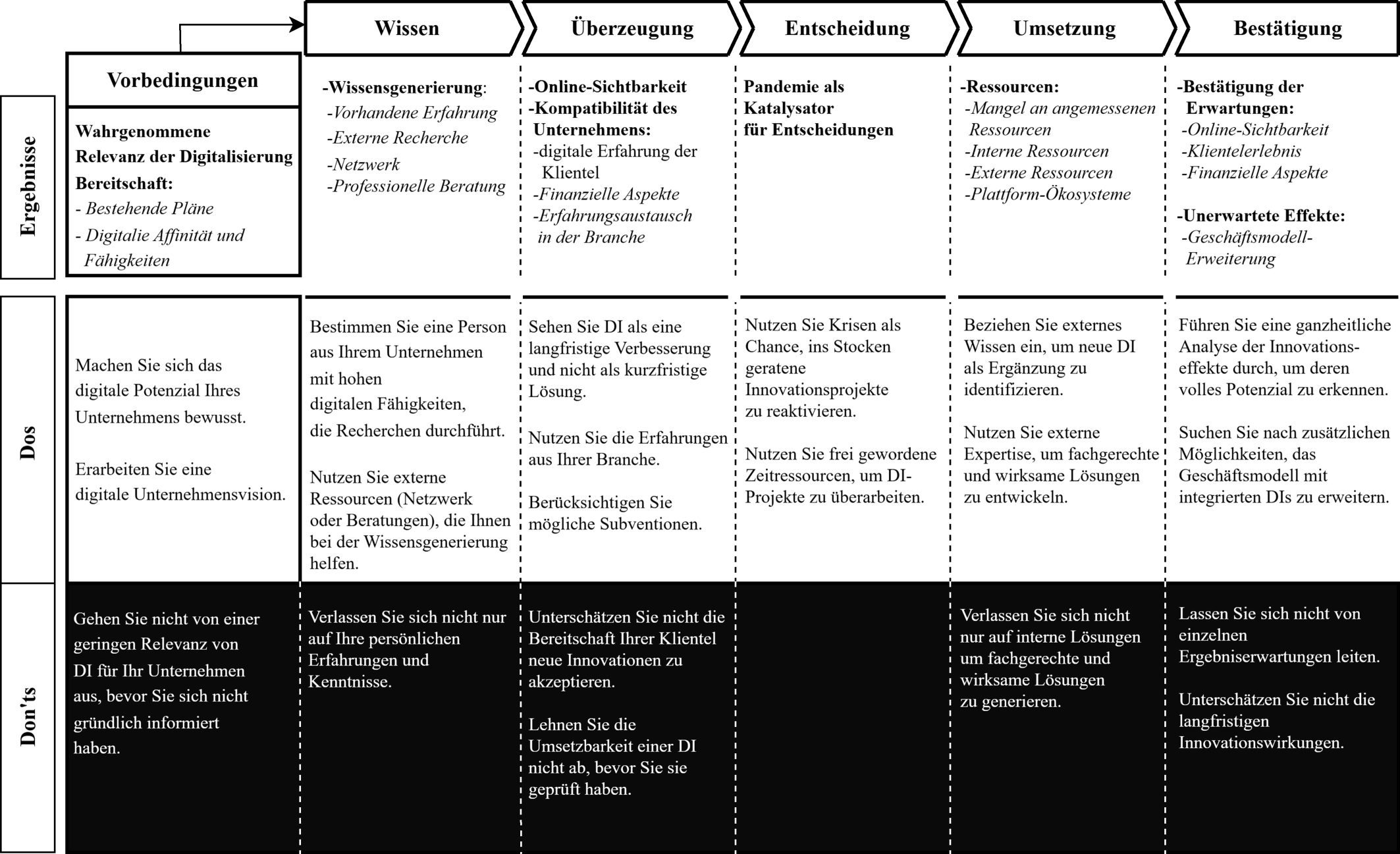 Basierend auf der Befragung von Führungskräften wird die Forschungsfrage beantwortet, wie die COVID-19-Pandemie die Entscheidungsprozesse für DI in KMU beeinflusst hat. Die Ergebnisse deuten insbesondere darauf hin, dass der Entscheidungsprozess in Bezug auf die Einführung und Nutzung von DI allgemein beschleunigt und zugunsten der Einführung neuer Technologien beeinflusst wurde. Die hierfür relevanten Faktoren wurden den einzelnen Prozessabschnitten des IDP zugeordnet. Für die Praxis wurden je Prozessschritt aus den Faktoren Handlungsempfehlungen („Dos and Don’ts“) abgeleitet.