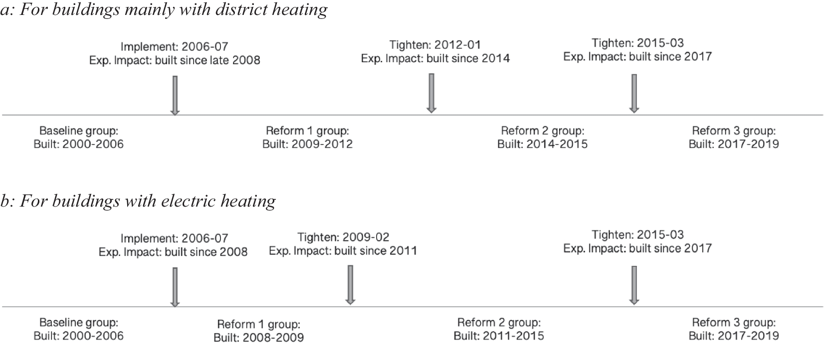 Figure 2 illustrates the basic study design and the sample selection for measuring the effects of introduced and tightened performance-based building codes on energy use. For buildings with a heating method other than electric heating (see Fig. 2a), as the performance-based regulation came into force after July 2006 (Reform 1), I exclude buildings constructed in 2007–2008 from the analysis.8 Similarly, for studying the effect of the tightened building codes in January 2012 and March 2015 (Reform 2 and Reform 3), I exclude buildings constructed in 2013 and 2016, respectively.