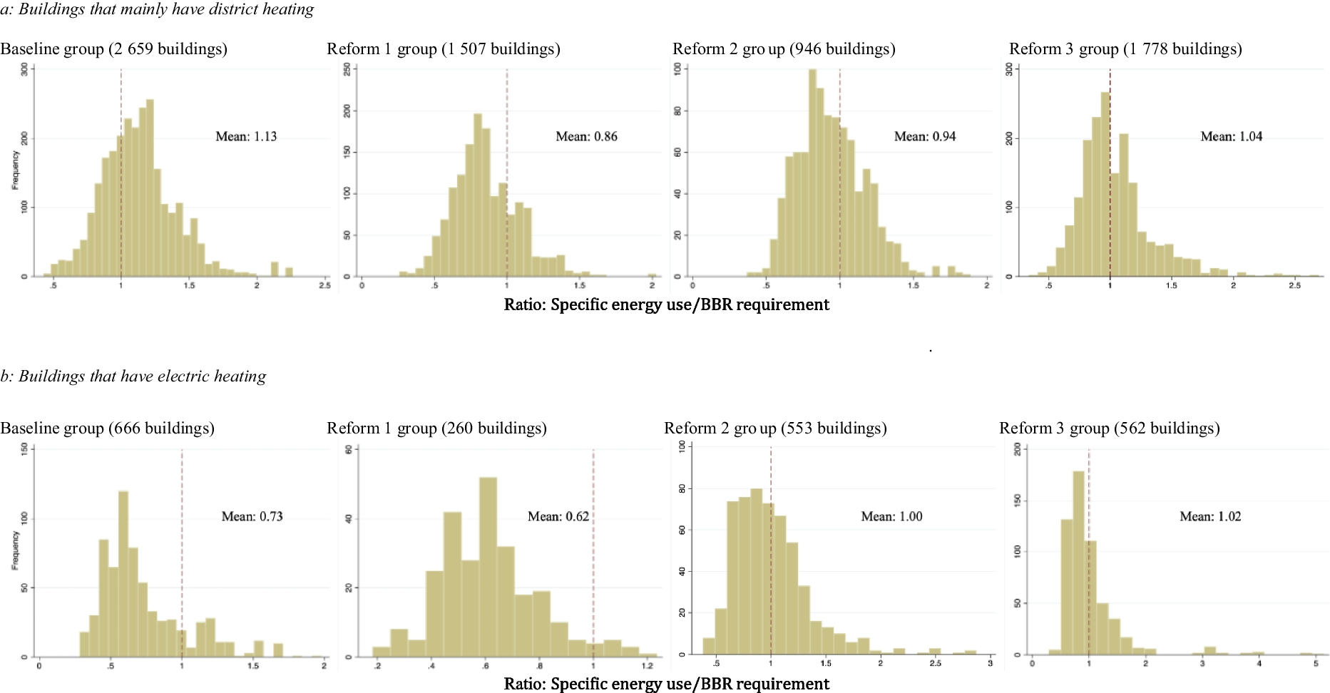 ***, **, and * denote significance at the 1%, 5%, and 10% significance level, respectively. Reform 1 is the indicator variable for the introduction of performance-based building codes in 2006; Reform 2 is the indicator variable the first tightened building codes (in 2009 for buildings with electric heating and in 2012 for those with district heating); Reform 3 is the indicator variable the second tightened building codes in 2015 for both types of buildings