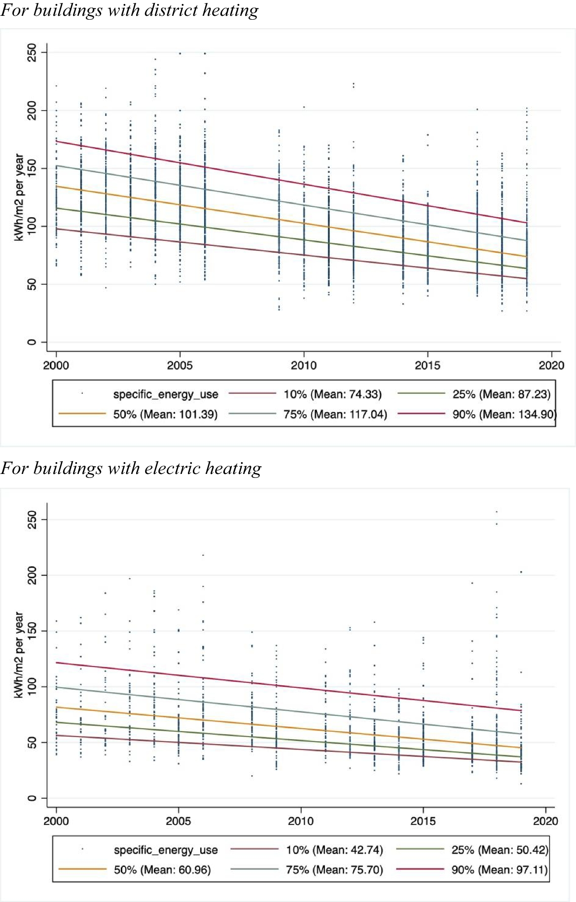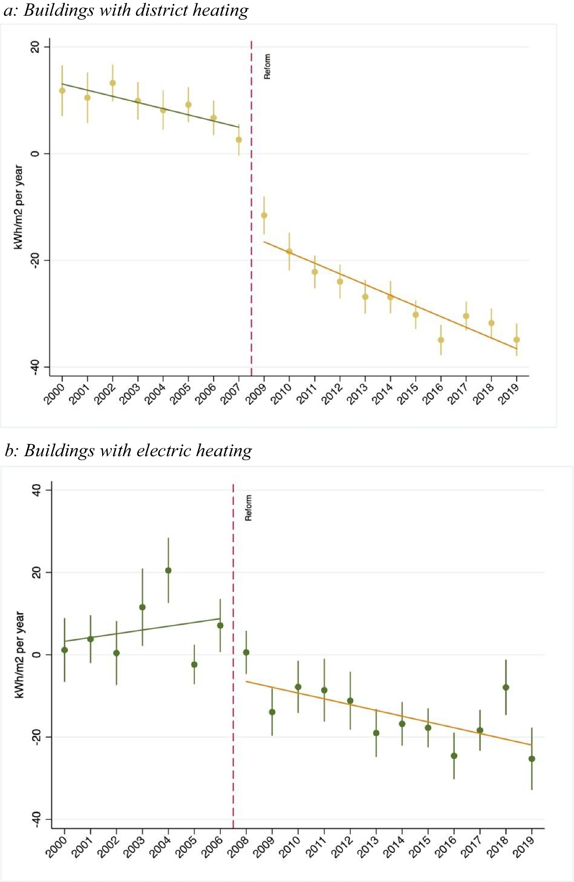 As can be seen in the figure, energy use does not always have a decreasing trend. For instance, the average energy use in buildings with district heating constructed in 2000–2005 is similar to energy use in buildings constructed in the 1980 s. One possible explanation for this is that older buildings may have undergone renovations, such as improvements to windows, walls, and other features. Therefore, when measuring the actual savings caused by changes in building codes, a direct comparison for energy use between new and old buildings may not be entirely fair. One strategy for dealing with this is to restrict attention to energy use in relatively new buildings, selecting those constructed after 2000 as the reference level, to minimize the possibility that other policy instruments (such as renovation programs) will bias the analysis.