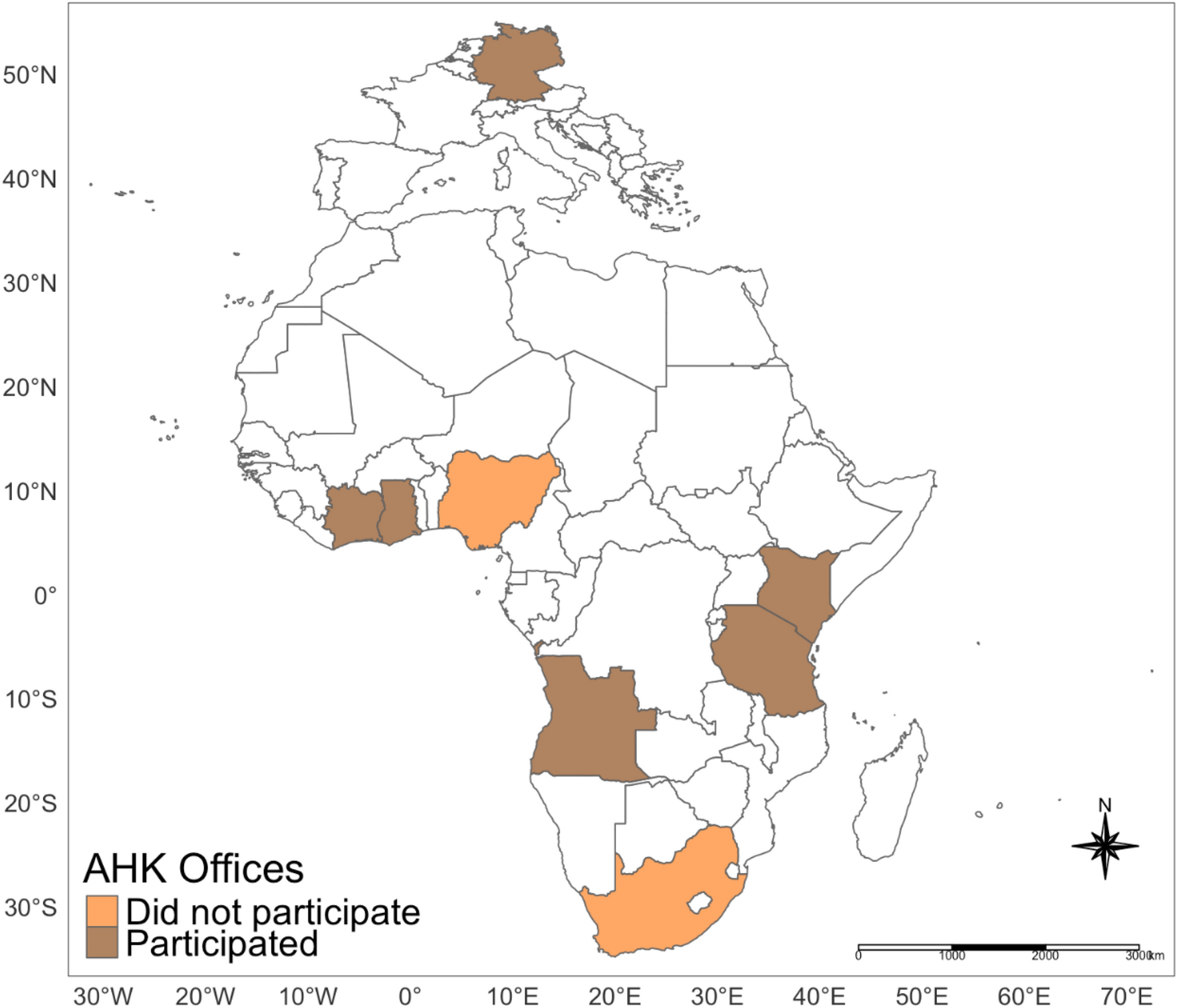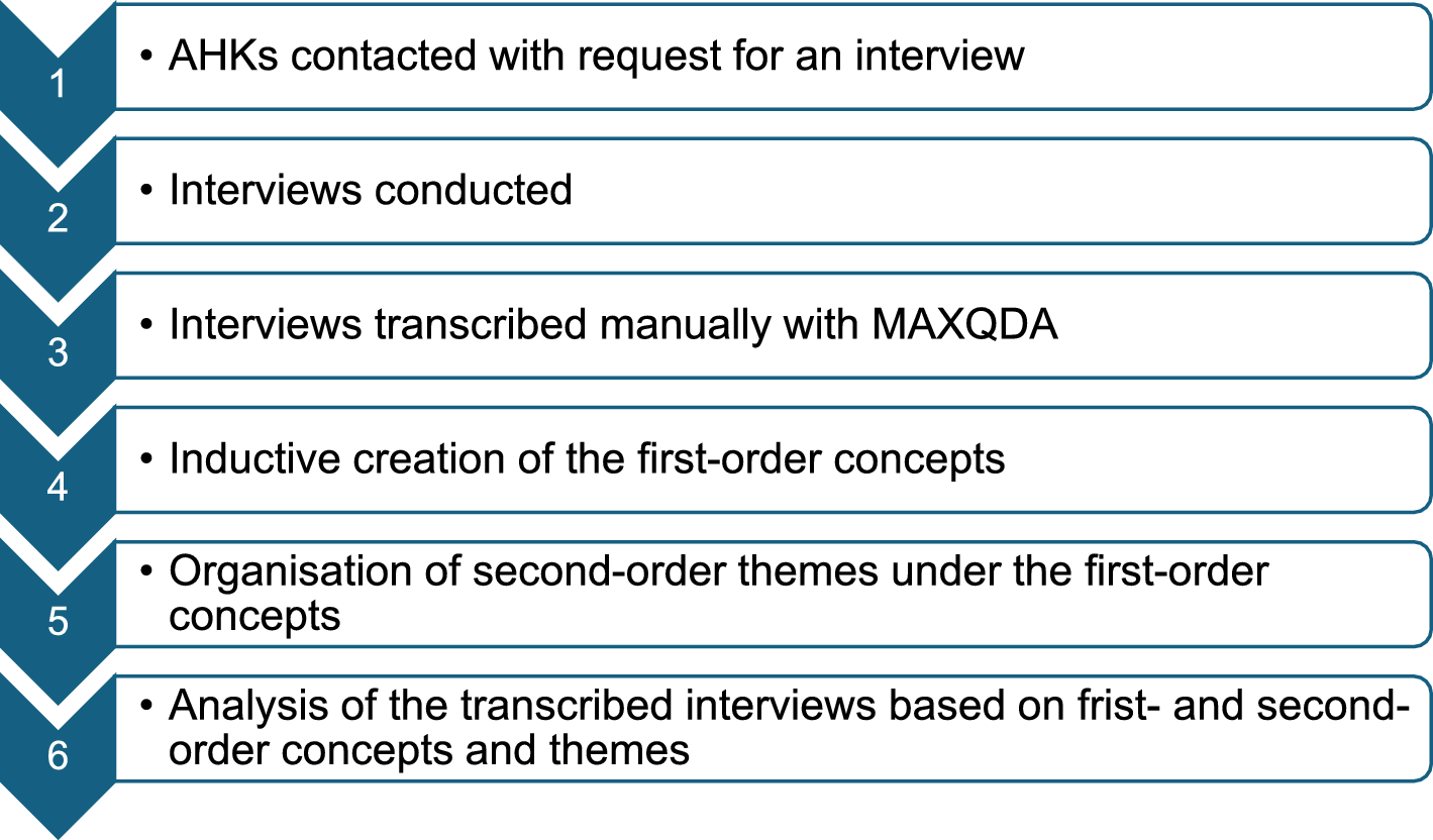 The interviews were held between June 2023 and January 2024 and took place in person (in Accra, Ghana, and Nairobi, Kenya) or through an online videocall. At the time the AHKs were contacted (including the head office in Berlin), there were 7 offices of interest here that could be contacted through the AHK website. Five of these Delegations participated in an interview (the offices in: Accra, Berlin, Dar-es-Salaam, Luanda, Nairobi), while their colleagues in Abidjan participated by filling in a questionnaire. The Delegations in Johannesburg and in Lagos were unavailable. The representations in Zambia and Mozambique were not available to be contacted through the central AHK website at the time. The interviews took place in the German or English language. The transcriptions are kept in the original language, but quotations from them are consistently presented in English in this paper. Where applicable, the translations were conducted by the author. The overall number of interviews conducted is rather small, as a total of 4 African delegations and the head office in Berlin participated. This number represents a positive response rate of 71%. Including the head office and those offices that could not be contacted, the interviews cover 50% of the underlying population. In total, 5 interviews and one written questionnaire was completed. The delegations that were interviewed are widespread and operate in many situations across the continent—with the three main European languages spoken being covered (English, French, and Portuguese, see: Alexander 1999, 1), as are the East, West, and Centre of the continent, as per the UN Statistics Division (2024). This widespread as well as the strong coverage of the overall population strengthens the validity of the results. The results are only related to Sub-Saharan Africa and should not be applied further afield as the situation there is different. From a theoretical standpoint alone, outside of Africa there are more robust and reliable networks which have a strong bearing on the basic premise of this study.
