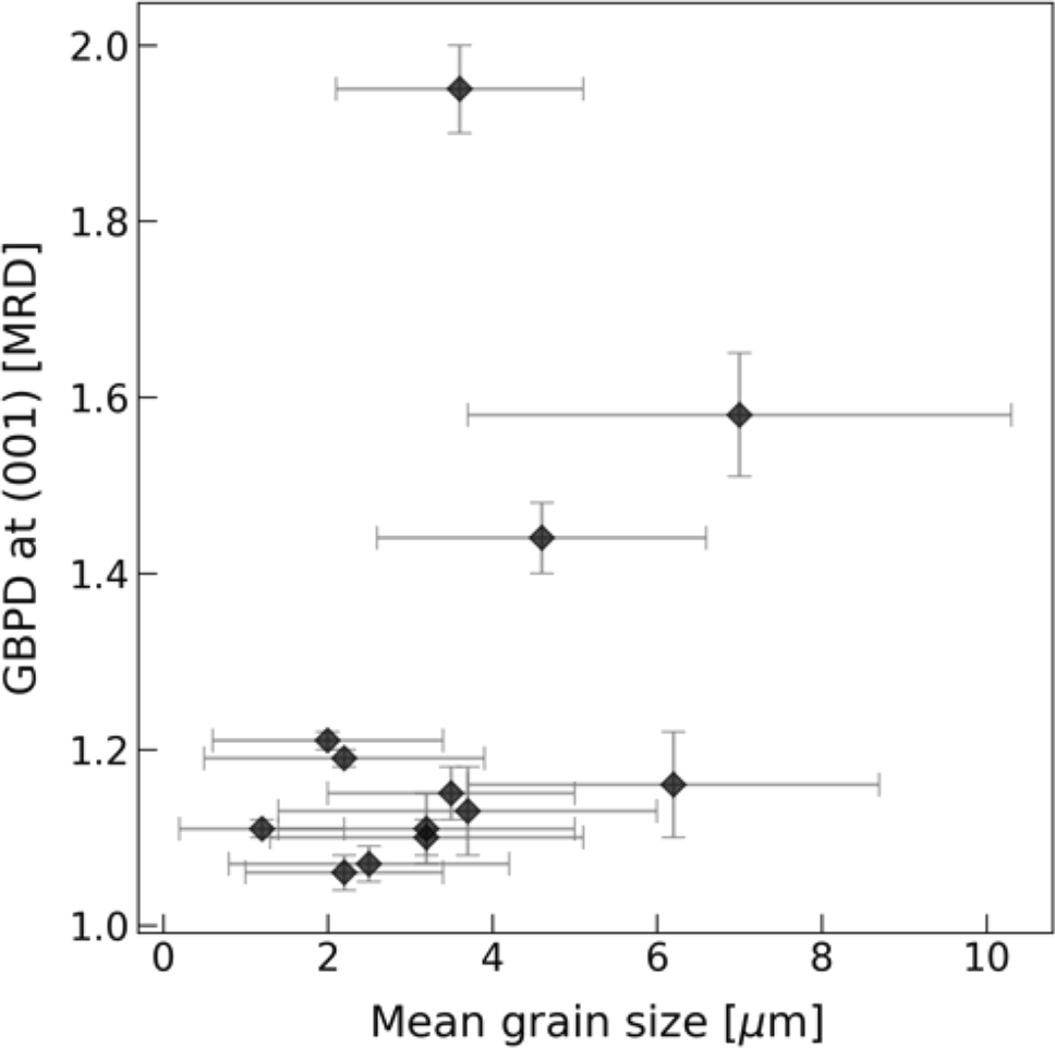 Values (in multiples of the random distribution) of grain boundary plane distributions at (001) pole as a function of mean grain size, cf. Figure 3