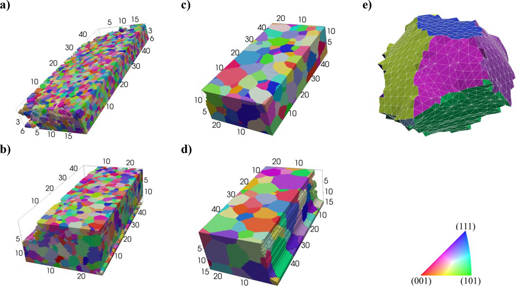 (a through d) Examples of three-dimensional orientation maps after complete post-processing. Maps were collected from (a) 1400 °C-2 h-1a, (b) 1450 °C-2 h-3, (c) 1525 °C-20 h-5, and (d) 1500 °C-20 h-3 datasets (cf. Table I). Colors correspond to the inverse pole figure (bottom right). Dimensions of the samples are given in \(\mu \) m. (e) Mesh segments of the reconstructed boundaries for a selected grain from 1450C-2 h-3. Diameter of this grain is 2.7 \(\mu \) m. Visualizations were created using ParaView (Color figure online)[24]