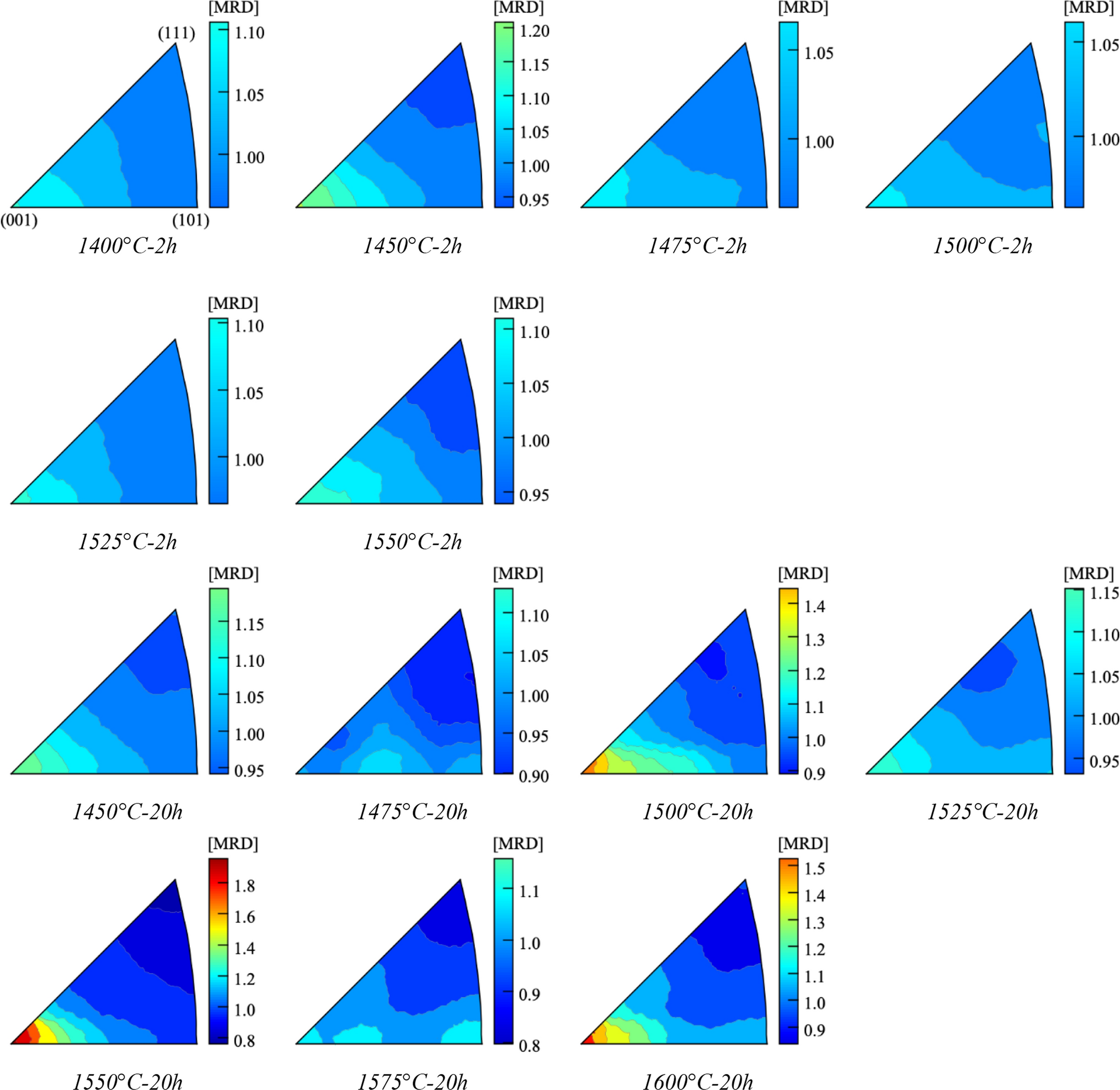 The textures of the cubic phase of samples sintered at 1500 °C-20 h, 1550 °C-20 h, 1575 °C-20 h, and 1600 °C-20 h are presented in Fig 6. As can be seen, all of them are very weak exhibiting mainly the so-called cube component {001} < 100 > with a maximum of 1.25 MRD. However, the strongest texture can be detected for the sample sintered at 1550 °C. This is in line with grain boundary analysis where the value of the GBPD at (001) reached the maximum. The second strongest texture has been measured for the sample sintered at 1500 °C. The two other samples are characterized practically by random texture with marginal cube components. A thorough analysis of (111) PFs shows also disfavor of near-(111) planes with respect to the sample coordinate system (CS, TD1, TD2)