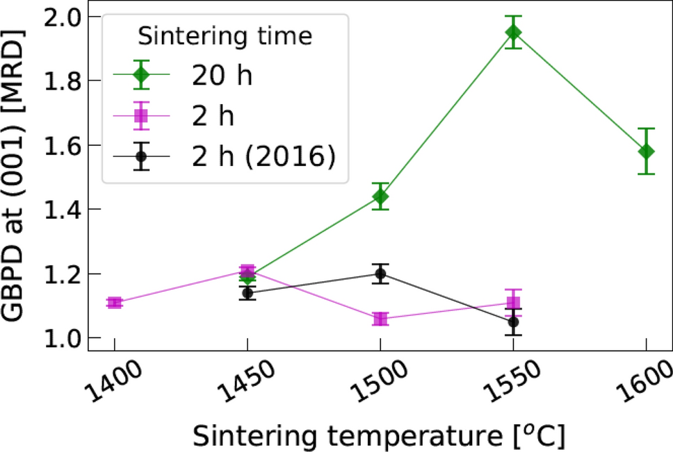 Let us first comment on the obtained GBPDs. This piece of analysis is essentially an extension of the initial studies carried out in Reference 10. Previously, three YSZ samples were investigated; they had been sintered for 2 h at 1450 °C, 1500 °C, and 1550 °C. For each of those samples, a relatively small peak at the (001) pole and a valley at (111) were observed. The heights of maxima at (001) ranged from 1.05 to 1.27 MRD. No relationship between the peak height and sintering temperature was claimed. In this work, we have had far more samples at our disposal, sintered in the range of temperatures from 1400 °C to 1600 °C and for two different times, mainly 2 and 20 hours. In order to allow direct comparison with the past result, the GBPDs for all new samples were computed utilizing the same KDE-based approach. Also, as in Reference 10, the same limiting distance, \({\varrho }_{p}=7^\circ \), was set. The new results indicate a similar preference for near-(001) planes and disfavor of near-(111) planes. The height of the (001) maximum is low in most cases—for 10 out of 13 samples, it varies from 1.06 to 1.21 MRD. Such heights fall into the same range as in the earlier study. The peak heights obtained in this and the previous work are compared in Figure 3. For materials sintered for 2 hours, the peak heights seem not to be influenced much by the sintering temperature. However, for samples sintered for 20 hours, there are three outliers. The heights for datasets 1500 °C-20 h, 1550 °C-20 h, and 1600 °C-20 h are 1.44, 1.95, and 1.58 MRD, respectively. Figure 10 shows the heights of the peak at (001) as a function of grain size. It appears that the outliers correspond to mean diameters greater than 3.6 \(\mu \)m. All samples sintered for 2 hours have mean grain sizes smaller than this value. Obviously, longer sintering led to grain growth. It is, however, not clear why the highest anisotropy (which is observed consistently across all subsets) is observed for 1550 °C-20 h—in this case neither the sintering temperature was the highest (among the investigated samples) nor the resulting grains are the largest. Based on our data, we might say that the presence of large grains (with mean diameter > 3.6 \(\mu \)m) is a necessary condition for stronger anisotropy to occur. One of the possible reasons is the strongest {001} < 100 > texture observed in this sample. Nonetheless, the question remains of what is the mechanism responsible for both preferred orientations of grains and their GBPDs at 1550 °C-20 h.