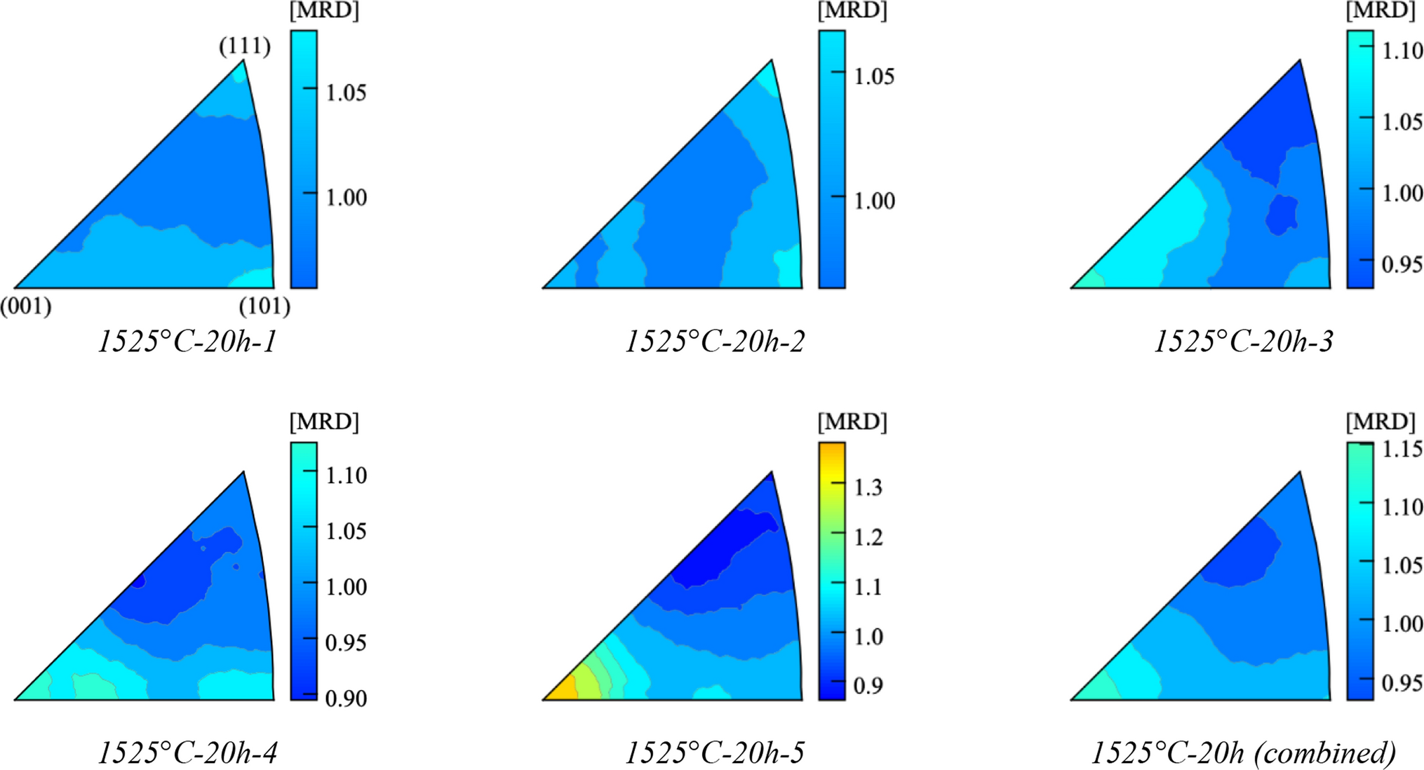 As a cross-validation, partial GBPDs for all subsets were calculated, too. Elevated values near the (001) pole are seen for majority of partial distributions as well. GBPD values at (001) for all subsets are listed in Table I. Some variations between samples collected from the same material are apparent. For instance, Figure 4 shows partial distributions for samples sintered for 20 hours at 1525 °C. This is an example with mild deviations between subsets. A quite sharp maximum at (001) with the height 1.38 ± 0.07 MRD is seen for subset 1525 °C-20 h-5. Weaker peaks of 1.11 and 1.12 MRD are present at this location for 1525 °C-20 h-3 and 1525 °C-20 h-4, respectively, and they exceed 1 MRD by about 2\(\sigma \) (with \(\sigma \) denoting the corresponding errors). Finally, for 1525 °C-20 h-1 and 1525 °C-20 h-2, 1 MRD is within about 1\(\sigma \), and no clear peaks are distinguishable. Merging the subsets together results in the value of 1.15 ± 0.03 MRD at (100).