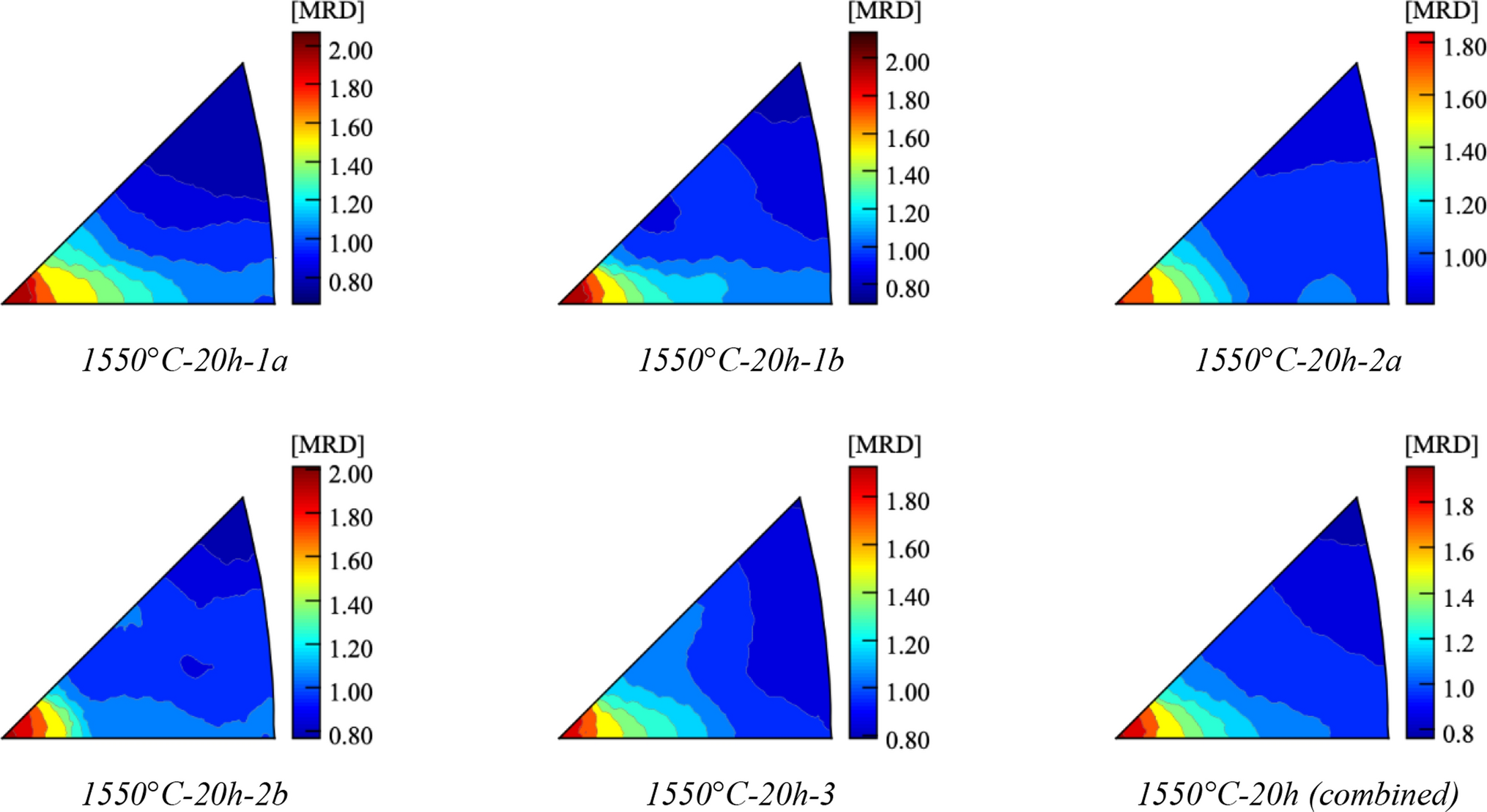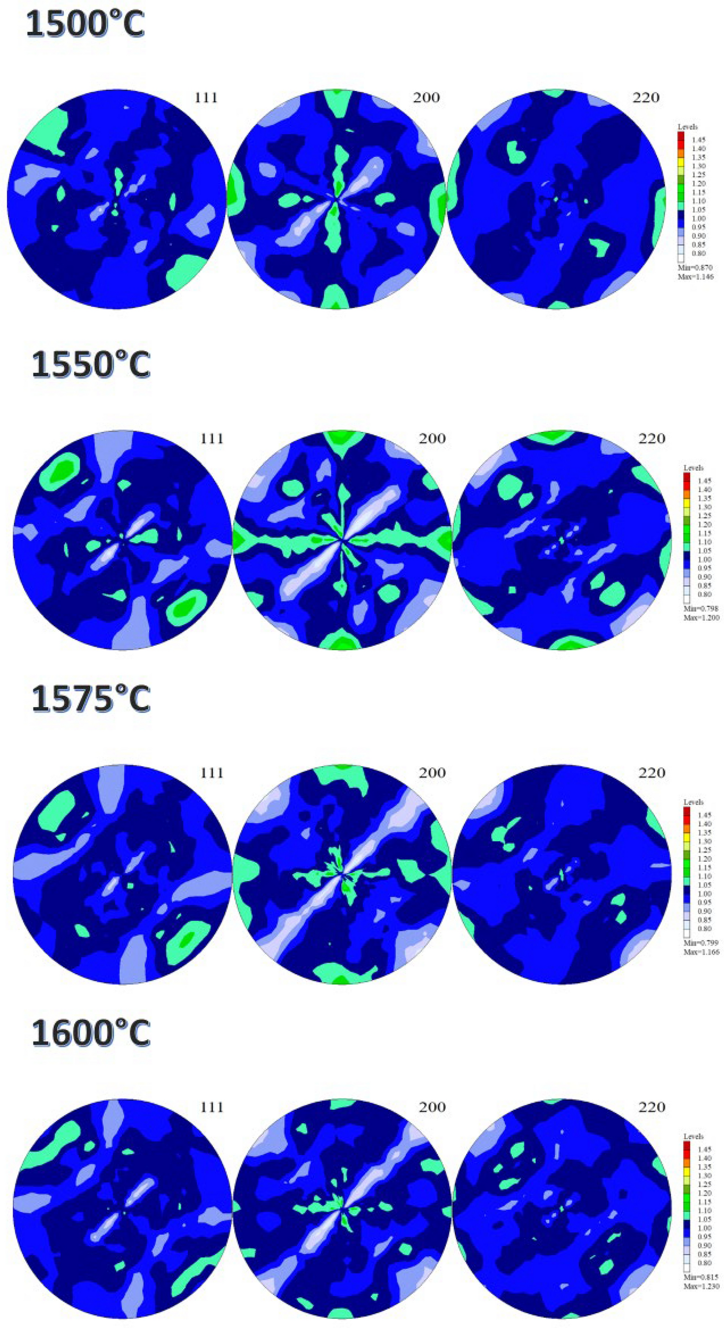 X-ray measurement of the global texture in the samples 1500 °C-20 h, 1550 °C-20 h, 1575 °C-20 h, and 1600 °C-20 h