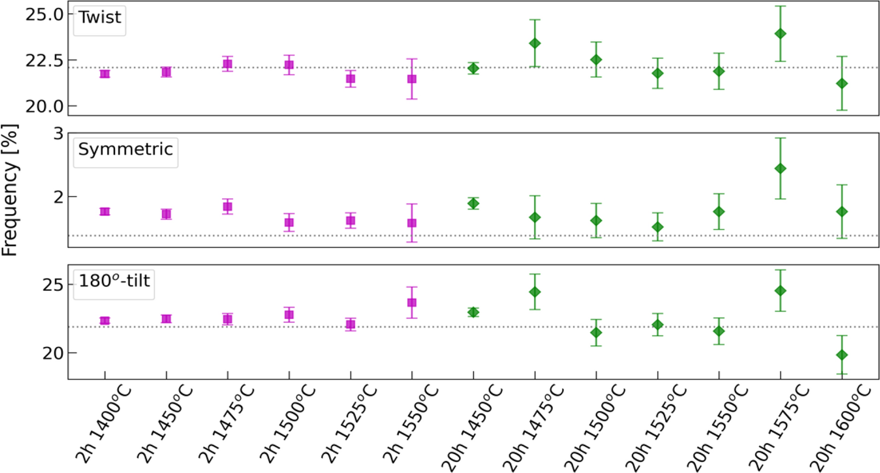 Another microstructure characteristic with crystallography of grain boundaries in the background is the frequencies of occurrence of geometrically characteristic boundaries. To recall, based on the five macroscopic boundary parameters, several special boundary geometries are distinguishable. A twist (tilt) grain boundary has at least one representation, where the misorientation axis is orthogonal (parallel) to the boundary plane. Symmetric (180 deg-tilt) boundaries are twist (tilt) boundaries, whose misorientations are rotations by 180 deg. To check if a given boundary is twisted, one can calculate the \({\alpha }_{N}\) parameter defined as the angle—minimized overall equivalent boundary representations—between the misorientation axis and the normal to the boundary.[29] Analogous parameters \({\alpha }_{S}\) and \({\alpha }_{I}\) were defined for symmetric and 180 deg—tilt boundaries, respectively.[30] If the parameter is below a certain threshold, then the boundary can be classified to the corresponding group. There exists a similar parameter for tilt boundaries, too, but current experimental capabilities do not allow to derive tilt from random boundaries for materials of cubic symmetry. The area fractions of twist, symmetric, and 180 deg-tilt boundaries for the investigated samples are collected in Figure 7 and compared with the percentages among random grain boundaries; the threshold of 8° was assumed as approximation of the measurement resolution (it takes into account accuracy of determining both misorientations and boundary inclinations).[26] The uncertainties \(\sigma \) were estimated using relative errors \(1/\sqrt{N}\), where \(N\) is the number of boundaries falling into the considered group. It turns out that the largest deviations from random boundaries occur for symmetric boundaries; for the datasets with the largest numbers of boundaries (1400 °C-2 hours, 1450 °C-2 hours, 1475 °C-2 hours, 1450 °C-20 hours), the over-representation exceeds 3\(\sigma \). The percentages for twist boundaries in YSZ are very close to those for random boundaries. For 180° tilts, slight divergence is observed for some samples.