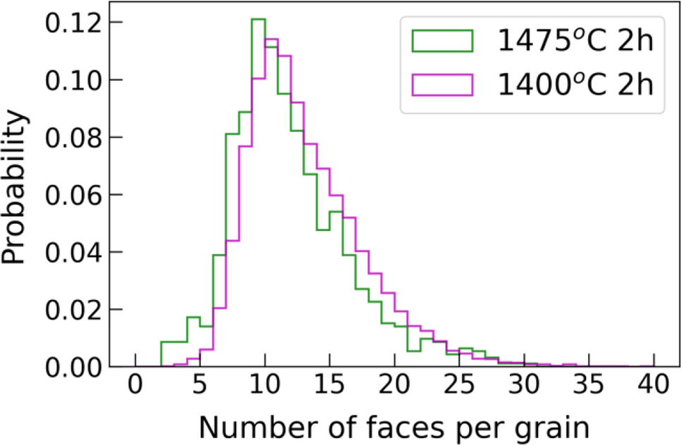 Apart from crystallography of grain faces, 3D data allow for studying topology of the microstructure. One of the topological aspects of microstructures is the distribution of the number of faces per grain. Figure 8 shows such distributions for two materials sintered for 2 hours at 1400 °C and 1475 °C 2 hours. The former is built of the smallest grains among all the investigated samples (mean diameter is equal 1.2 \(\mu \)m), the latter is composed of grains of medium-size (compared to other studied materials) with mean diameter of 2.5 \(\mu \)m The shapes of these distributions are similar, but the mean numbers of faces per grain are slightly different, respectively, 12.7 and 11.5. For this and below analyses, only the grains fully contained in the 3D maps are included; those cut by the outer surfaces of the maps were excluded in order to avoid bias. This prerequisite unfortunately reduces the number of useful grains in a dataset, and in consequence, such analysis is possible only for samples with relatively small grains where interior of the 3D map still contains many grains (e.g., Figures 1(a) and (b)). In the maps collected from large-grain materials, high fractions of grains lie on the outer surfaces and the number of remaining grains is insufficient for reliable investigations (e.g., Figures 1(c) and (d)).