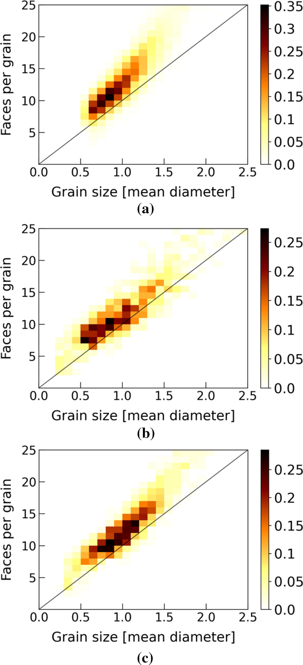 Figure 9 presents the probabilities of occurrence of grains as a function of their size and number of faces for three YSZ sinters: the two which are considered above and the one sintered for 20 h at 1450 °C with a mean grain size of 2.2 \(\mu \)m. A linear correlation between the number of faces per grain and grain diameter expressed as multiples of the mean grain diameter (for a given sample) is clearly seen. The corresponding Pearson correlation coefficients are 0.88, 0.89, and 0.92 for 1400 °C-2 h, 1475 °C-2 h, and 1450 °C-20 h, respectively. The graphs for the latter two datasets are very similar. Compared to those two, the first one looks like it was cropped. The cut-off at about 0.5 times the mean grain diameter is related to the minimum number of voxels needed to form a grain. With the mean diameter of 1.2 \(\mu \)m, voxels being cubes with edges 0.2 micron long, and the requirement of at least 20 voxels, there are no grains smaller than 0.5 times the mean diameter in the data. Nevertheless, the correlation between the grain size and number of faces per grain is observed for all samples. Similar correlation was observed earlier for titanium[13] and brass.[15]