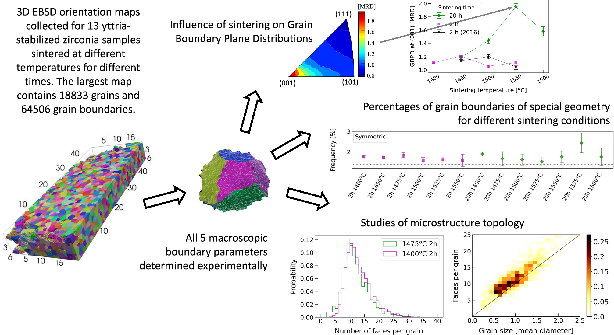A large set of 3D orientation maps for the YSZ samples was collected utilizing 3D EBSD technique. This is probably the largest collection of this type registered for zirconia and the most diverse in terms of sintering time and temperature, and consequently, grain size. These data were used for investigation of anisotropy in grain boundary plane parameters, frequencies of occurrence of geometrically characteristic boundaries, and number of faces per grain.
