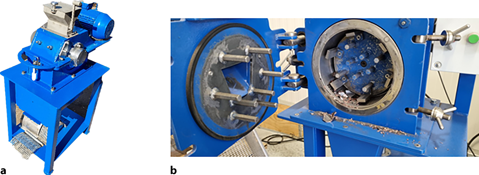 Units for secondary crushing of lithium-ion batteries: a LITech HM 200 hammer mill with serrated hammers; b LITech RM 250 rotor mill