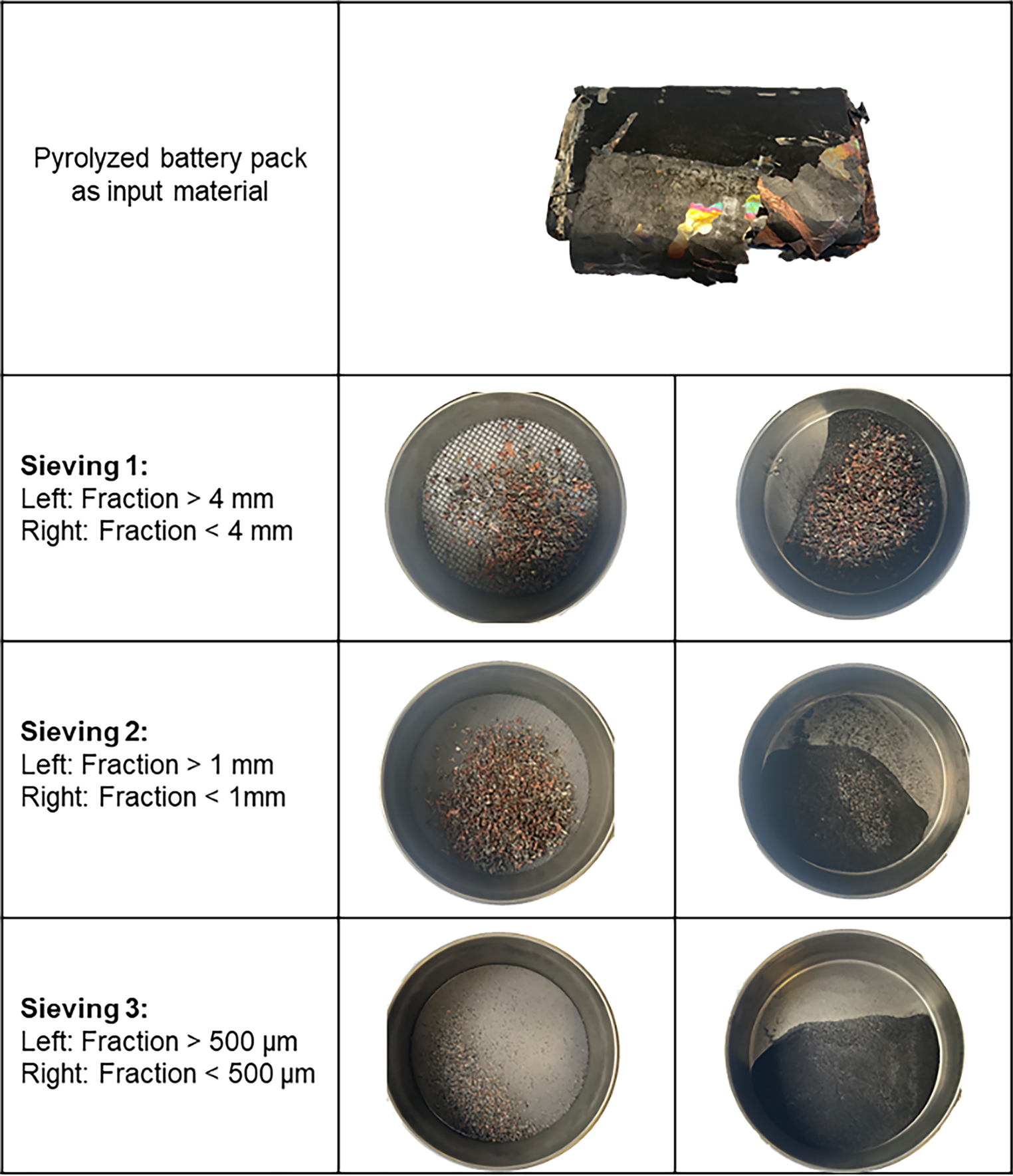Pyrolyzed battery pack and sieve sections 1–3 at 4, 2 and 0.5 mm after crushing by the LITech hammer mill HM 200