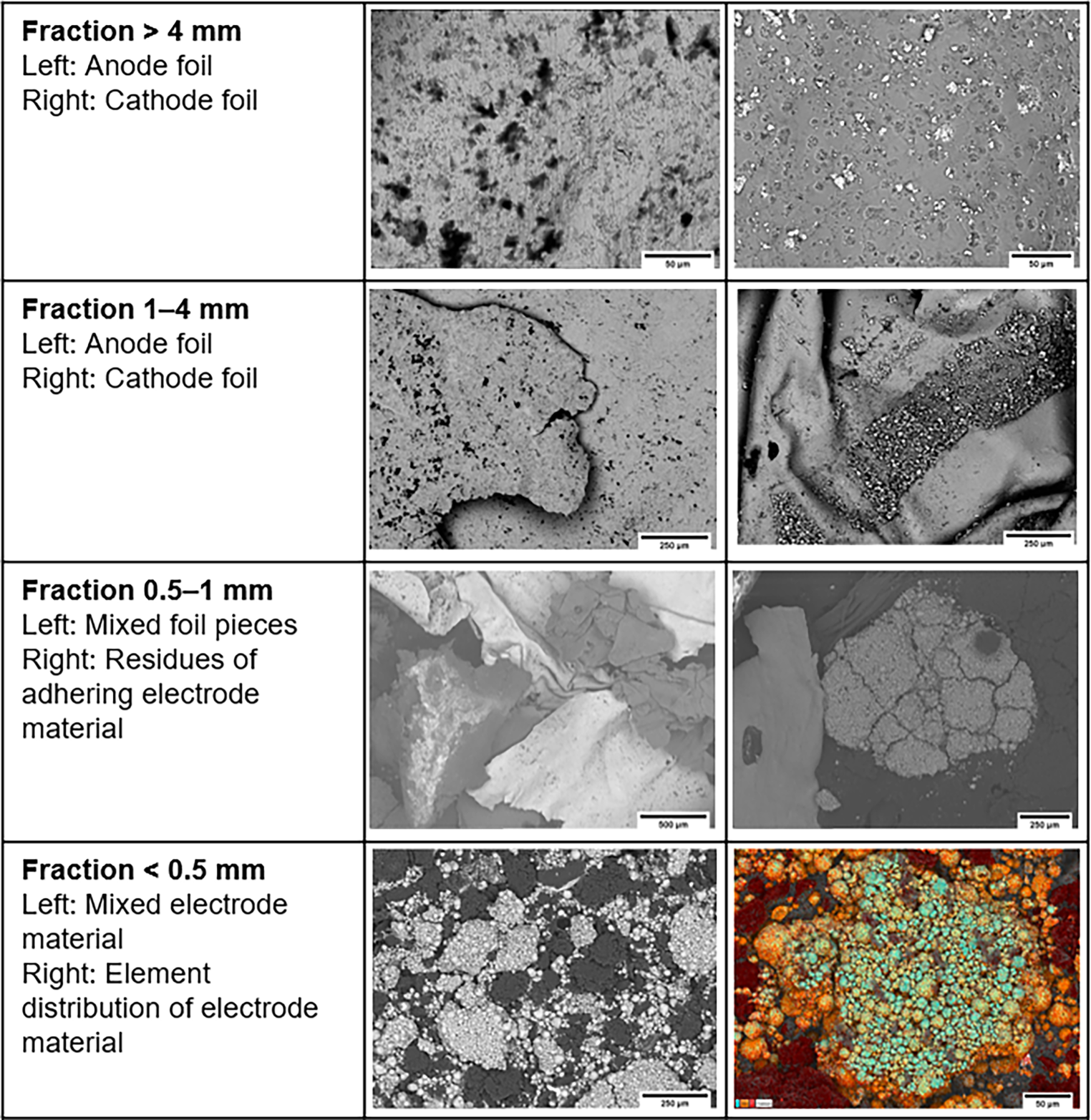 In order to be able to estimate the efficiency of the pre-treatment as well as possible material losses due to adhesions of the active material to cathode and anode foils, the microscopic recording is carried out in the digital as well as scanning electron microscope (see Fig. 3). It can be proved that individual remnants of active material can be seen on both the cathode and the anode foil of the fraction above 4 mm, but the majority can be separated by means of comminution in the hammer mill and subsequent sieving.