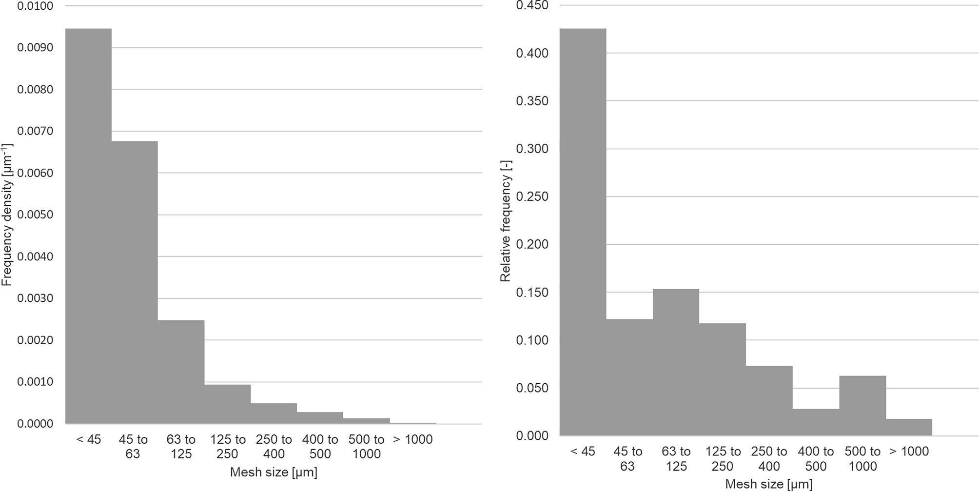 The following section shows the evaluation of the sieve analysis carried out for the fraction of the active material obtained starting with the sieve size of 1 mm. For this analysis, an amplitude of 0.7 mm and a sieving time of 3 min were applied. The evaluation resulted in characteristic values for the Sauter diameter of d32 = 41.99 µm and d50 = 53 µm. Figure 4 shows the corresponding frequency distribution and the relative frequency.
