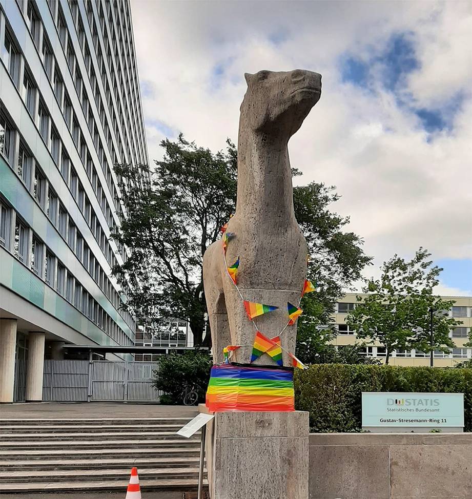 Das Interview fand während der Feierlichkeiten zum 75. Jubiläum des Amts statt. Abb. 1 zeigt die beiden Interview-Partner vor der Tribüne der Festveranstaltung. Vor dem Eingang zum Hauptgebäude des Statistischen Bundeamtes (Abb. 2) bewunderte ich die große Statue eines Pferdes, von Spöttern gerne als „Amtsschimmel“ tituliert. Im Stil ist es monumentalen Darstellungen aus der Zeit des Nationalsozialismus ähnlich. Diese Assoziation ist durchaus korrekt, da die Statue von einem etablierten Künstler des NS-Kulturbetriebs geschaffen wurde. Die jüngst an der Plastik angebrachte Tafel1 weist darauf hin, dass der nahtlose Übergang von NS-Künstlerkarrieren in die Bundesrepublik durchaus kein Einzelfall war. Die Girlanden in den Regenbogen-Farben waren Teil der Ausschmückung für das Amtsfest aus Anlass des Jubiläums.