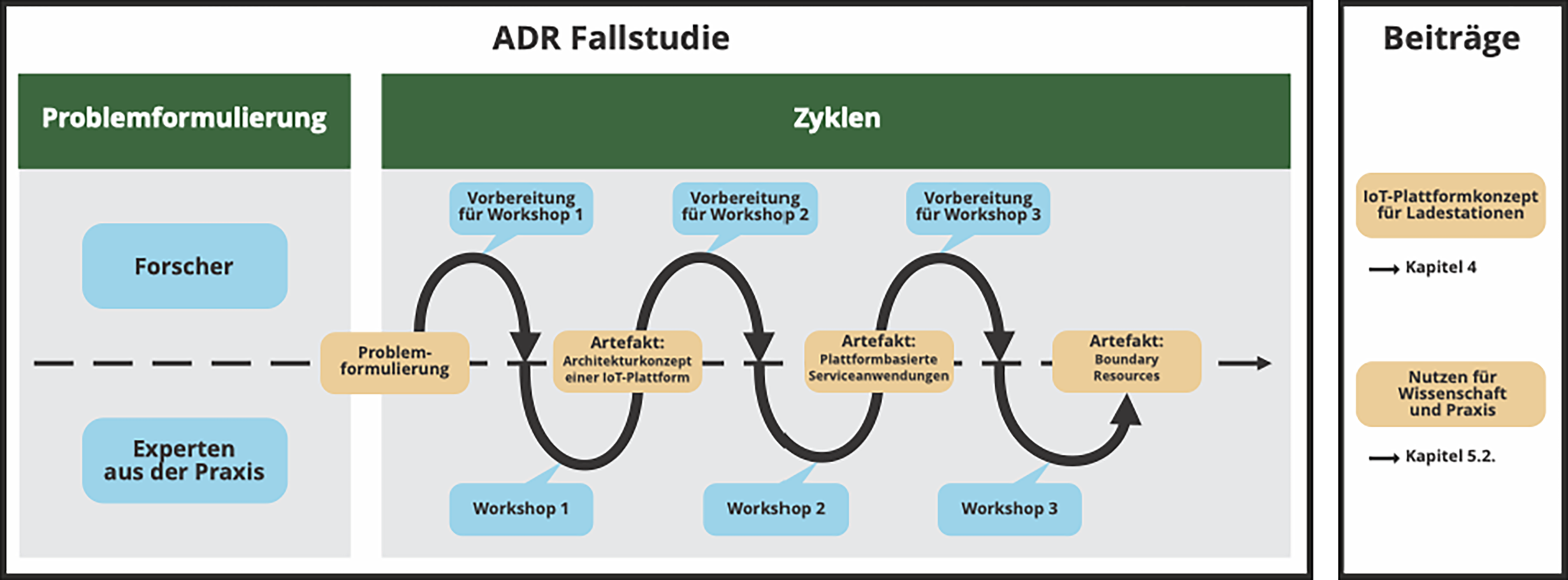 Angesichts des Mangels an Studien zum Einsatz digitaler Plattformen in der Ladeinfrastruktur wurde zur Beantwortung der Forschungsfragen eine Action Design Studie (ADR) durchgeführt. ADR verbindet den Ansatz der interventionistischen Aktionsforschung zur Lösung von Organisationsproblemen mit dem Forschungsparadigma der Design Science zur iterativen Entwicklung von Artefakten (Sein et al. 2011). Dabei agieren die Forscher nicht nur als Beobachter, sondern gestalten Artefakte zusammen mit Experten aus der Praxis. Die Experten wurden aus einem neu entstehenden Plattformökosystem im Kontext intelligenter Ladeinfrastruktur rekrutiert. Sie gehören dem Plattformanbieter ChargeIQ GmbH sowie den Wertschöpfungspartnern (u. a. Hersteller von Ladestationen) und Pilotkunden des Plattformanbieters an. Das erarbeitete Artefakt ist das Plattformarchitekturkonzept inklusive der darauf aufbauenden Serviceanwendungen und Boundary Resources, die für die Entwicklung der Serviceanwendungen in Kooperation mit den Partnern benötigt werden.