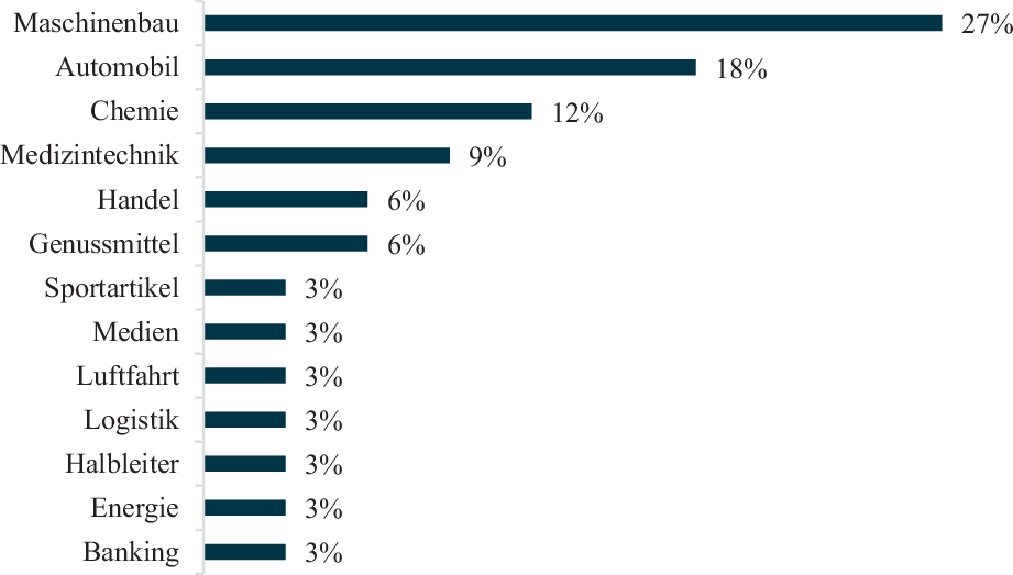 Die CIOs und IT-Führungskräfte sind in 14 unterschiedlichen Branchen tätig, darunter Automobil, Chemie, Handel, Maschinenbau und Medizintechnik. Diese Streuung ermöglicht einen breiten und branchenübergreifenden Einblick in die Umsetzung des IT-Near- und Offshorings in Deutschland. Im Median weisen die Unternehmen einen Umsatz von 4,1 Mrd. € auf und beschäftigen im Median 16.300 Mitarbeiter und Mitarbeiterinnen. Tab. 1 im Anhang gibt Aufschluss über die Unternehmensdaten der Interviewteilnehmer und -teilnehmerinnen. Abb. 1 zeigt die Aufschlüsselung der Branchen der jeweiligen Unternehmen.