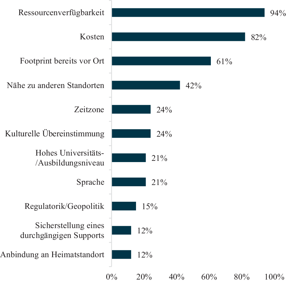 Das Hauptstandortauswahlkriterium für Unternehmen mit bestehenden IT-Near- oder Offshoring-Standorten ist laut 94 % der Befragten die Verfügbarkeit von Ressourcen. Dies ist auf den Fachkräftemangel zurückzuführen, der dazu führt, dass die befragten Unternehmen die benötigten IT-Fachkräfte nicht mehr am Heimatstandort in Deutschland finden. Für die Entscheidung von IT-Near- und Offshoring-Standorten orientieren sich die Unternehmen an der Verfügbarkeit der benötigten Fähigkeiten, was zu einer weltumspannenden Organisation führt. Dies bestätigt auch ein CIO aus der Automobilbranche: „Da muss ich mich heute als IT so aufstellen, dass ich dorthin gehe, wo ich die Skills finde und nicht umgekehrt“. Die globale Struktur der IT-Organisation betont ein CIO aus der Chemiebranche: „Das [Team] ist einfach über die gesamte Welt verteilt und das ist einfach das Resultat davon, wo finden wir die richtigen Leute“.