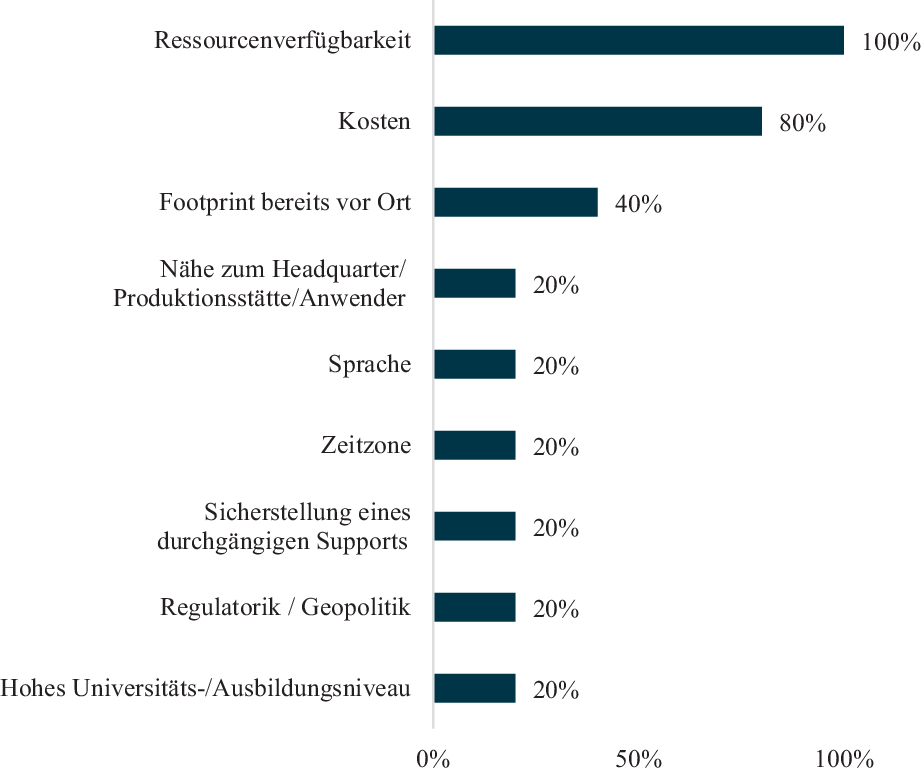 An dritter Stelle mit 61 % folgt eine bereits vorhandene Präsenz als Argument für einen IT-Near- oder Offshoring-Standort in einem Land. Das kann sowohl ein Standort einer anderen Supportfunktion als auch ein Produktionsstandort des Unternehmens sein. Solche Standorte erleichtern den Aufbau einer IT-Serviceorganisation, da auf bestehende Unternehmensstrukturen zurückgegriffen werden kann, einschließlich Bürogebäuden, rechtlicher Rahmenbedingungen und unterstützender Funktionen wie HR und Finance. Mehrere Interviewpartner und -partnerinnen, darunter ein CIO aus der Automobilbranche, beschreiben dieses Motiv sogar als „[…] Grundprämisse, dass wir sagen, wir möchten natürlich grundsätzlich nur in Regionen oder auch in Ländern vertreten sein mit der IT, wo wir auch selbst einen Footprint haben als Firma“. Ein CIO aus der Baubranche beschreibt es als „unheimlich schwierig, in einem Land, wo man jetzt kein Büro oder sowas hat, dort entsprechend Fuß zu fassen“.