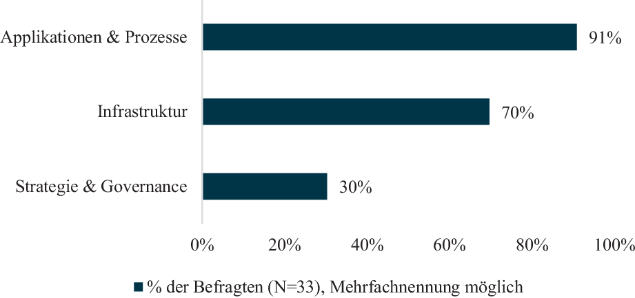 Applikationen und Prozesse werden von IT-Near- und Offshoring-Mitarbeitern und -Mitarbeiterinnen zu 91 % und damit am häufigsten bereitgestellt. Die erbrachten Tätigkeiten umfassen dabei klassische Softwareentwicklung, IT-Sicherheit und Applikationsmanagement. Anwendungen wie SAP-Systeme, Business Intelligence und Produktionssysteme, wurden dabei am häufigsten genannt.