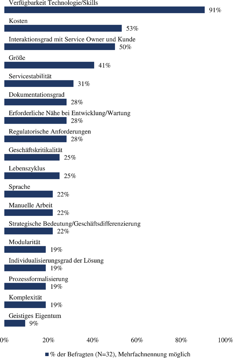 Die Verfügbarkeit der Technologie und der entsprechenden Skills stellt mit 91 % das am häufigsten genannte Auswahlkriterium dar. Die Befragten waren sich einig, dass der Fokus hierbei nicht auf der Technologie, sondern auf der Verfügbarkeit der Skills liegt. Das Kriterium spiegelt den Fachkräftemangel wider, auf den die Unternehmen bei der IT-Near- und Offshoring-Serviceerbringung stoßen. Dass es sich um einen weltweiten Trend handelt, unterstreicht der CIO eines Automobilzulieferers: „Dieser War for Talents [ist] mittlerweile kein rein deutsches Phänomen mehr“. Vor welcher großen Herausforderung Unternehmen stehen, wird in der Aussage eines CIOs aus der Medizintechnik-Branche deutlich. Aufgrund des Fachkräftemangels, „[muss man froh sein], wenn wir irgendwo noch Ressourcen bekommen“.