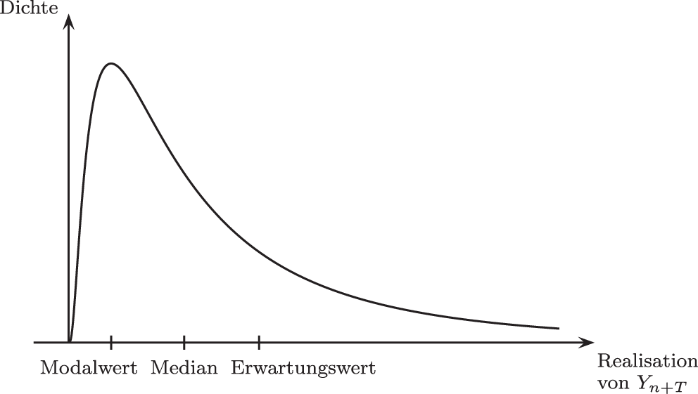 erwartungstreu schätzen. Die Prognoseprozedur \(f_{5}(n,T)\) ist bei Jacquier et al. (2003) vorgeschlagen worden. Da der Erwartungswert von \(Y_{n+T}\) auf Grund der rechtsschiefen Verteilung auf lange Sicht mit Wahrscheinlichkeit 1 unterschritten wird, ist \(f_{5}(n,T)\) aber trotz der Erwartungstreue kein gutes Prognoseverfahren.