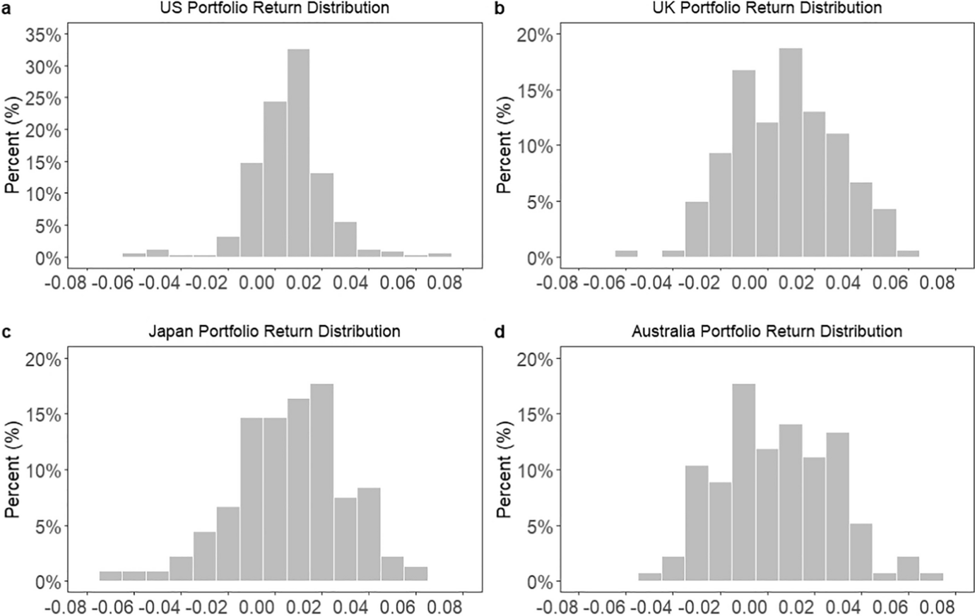 Portfolio Return Distribution. Note: Appendix 4 plots the distribution of portfolio returns for our inflation hedging portfolios. Panel a) is the distribution of US portfolio returns. Panel b) is based on the portfolio returns of the UK. Panel c) and d) are based on the portfolio returns of Japan and Australia, respectively