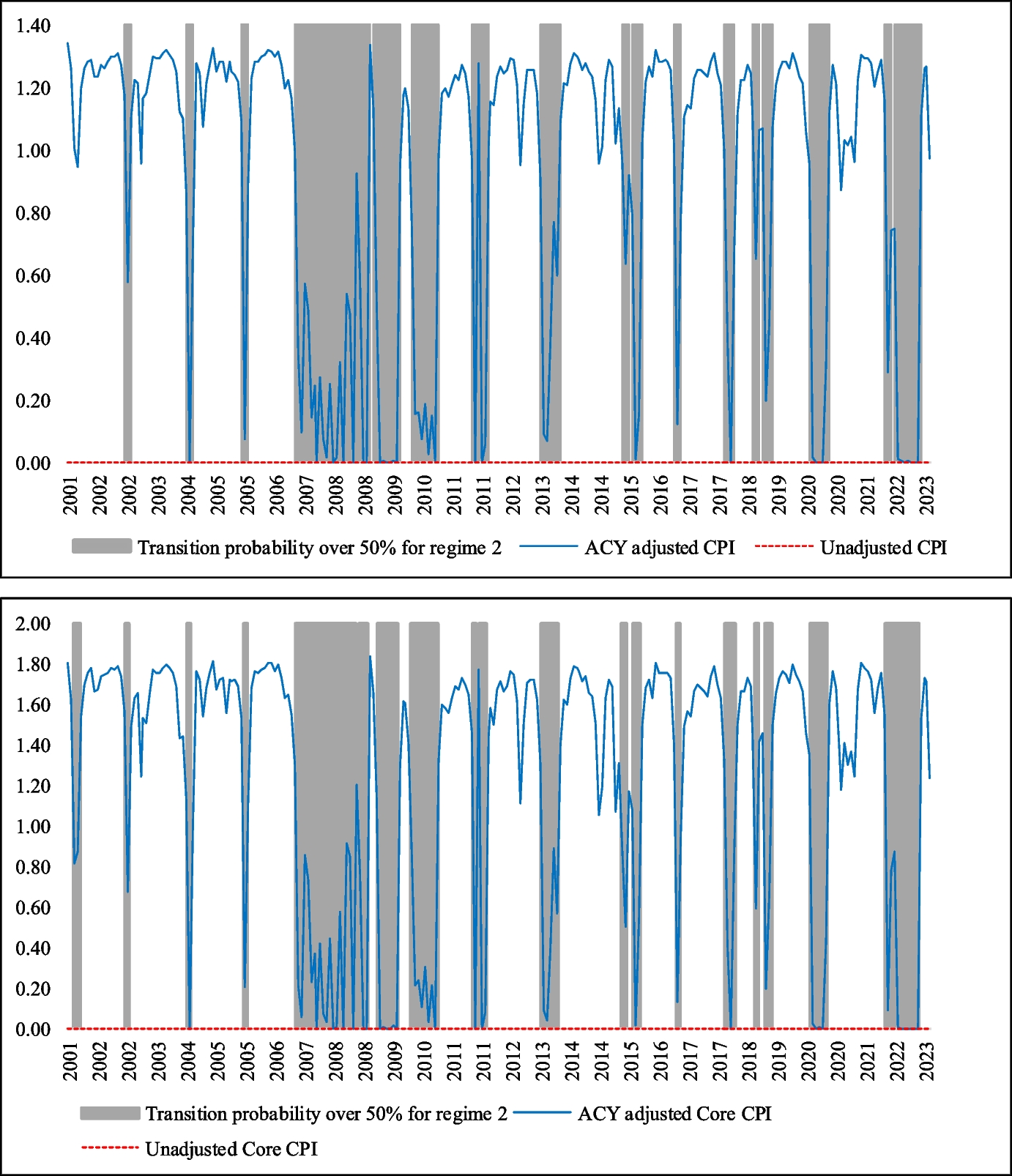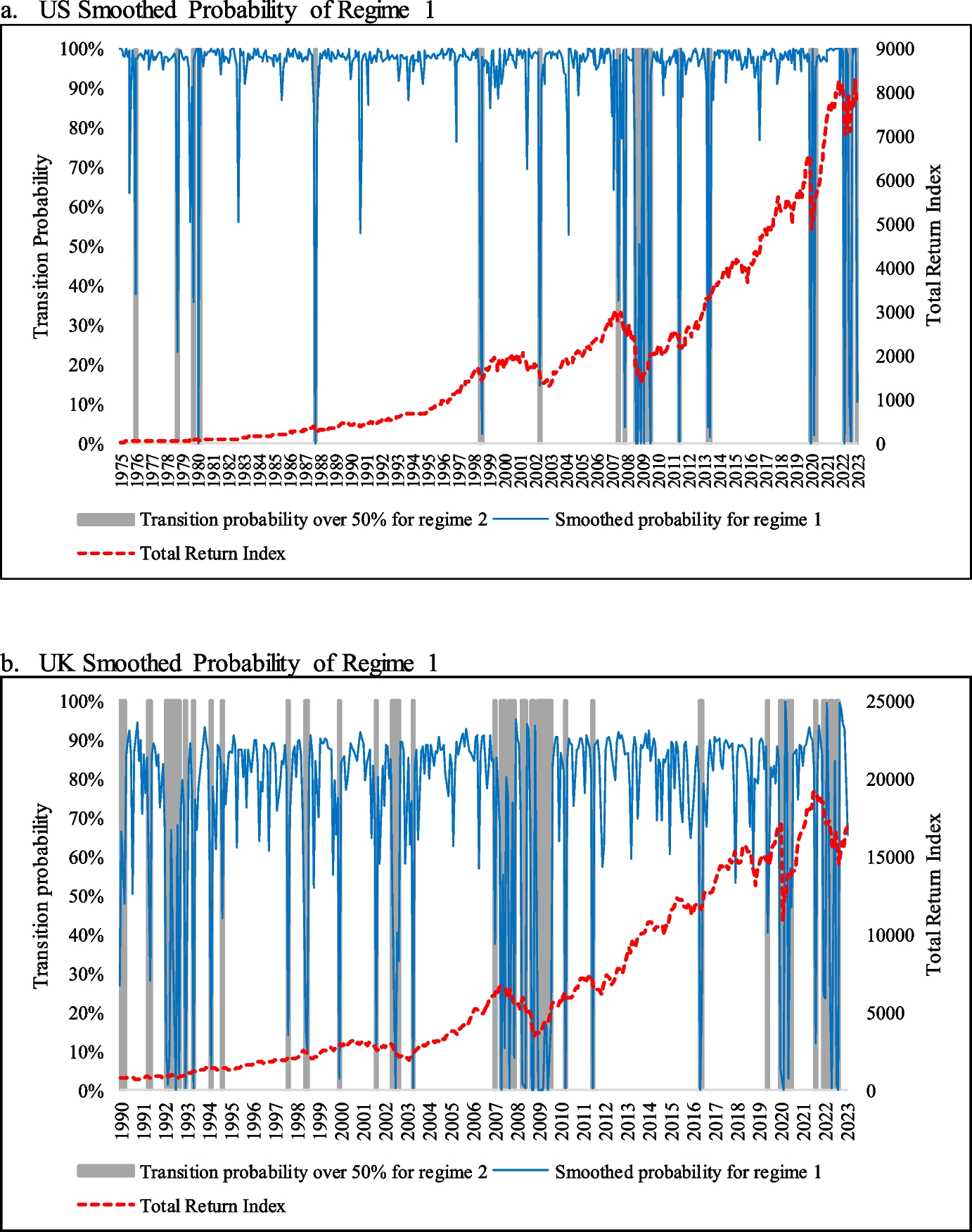 Our paper extends the literature by combining Vector Error Correction Model (VECM) with a Markov-regime switching process. We follow Beckmann and Czudaj (2013), who analyze whether gold possesses the ability to hedge against inflation but from a new perspective. By using data from four major global economies, they allow for non-linearities while they also discriminate between long-run and time-varying short-run dynamics. A Markov switching vector autoregressive model (MS-VAR) has also been used by Chiang et al. (2020), who observe the dynamic relationships between housing market returns and stocks in the US. They identify a significant regime-dependent autocorrelation between stock and housing returns in both low-volatility and high-volatility regimes.