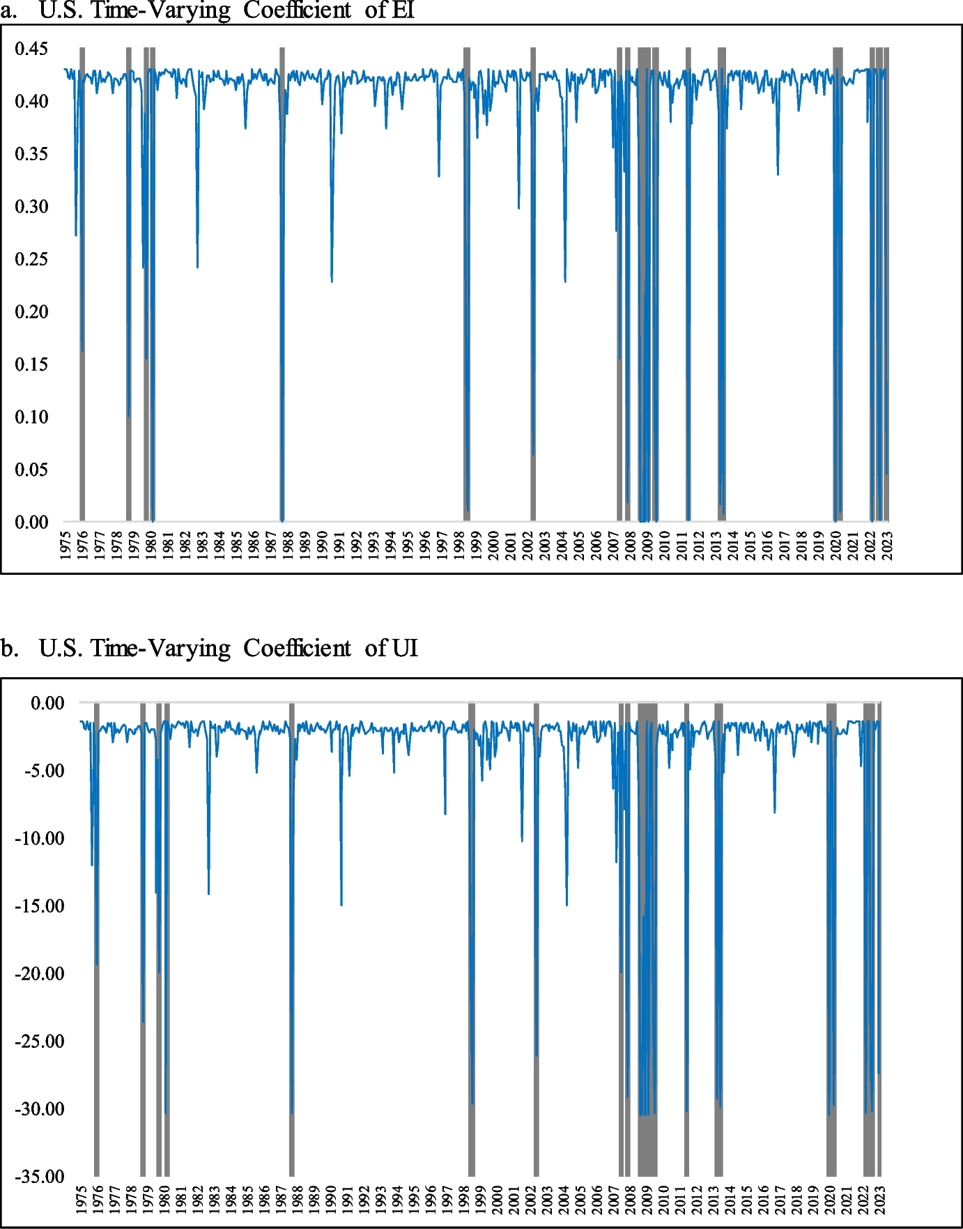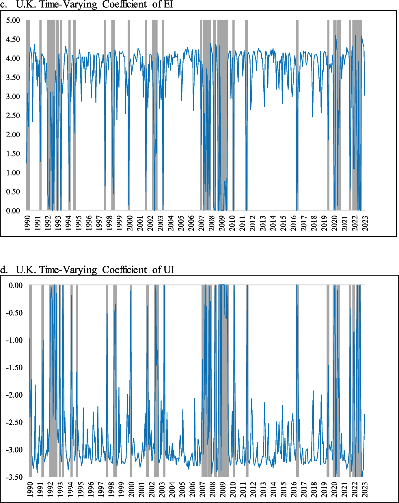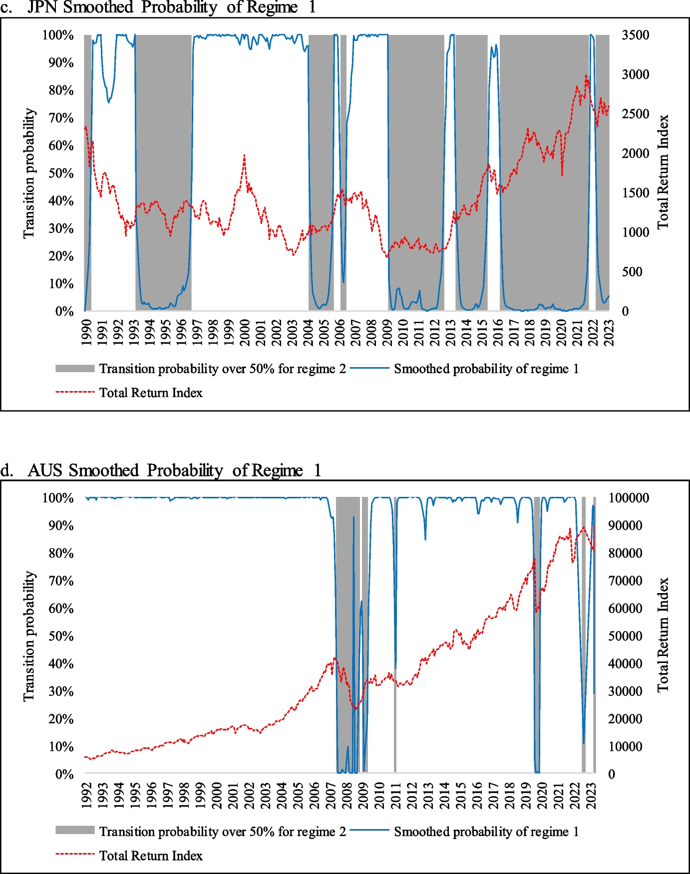 We use the Expectation–Maximization (EM) algorithm to estimate the parameters of the Markov-switching model and to identify the different states or regimes by maximizing the data likelihood function. In our case, the EM algorithm is used to estimate the parameters that govern the probability of switching from one state (or regime) to another, as well as the parameters of each individual state.