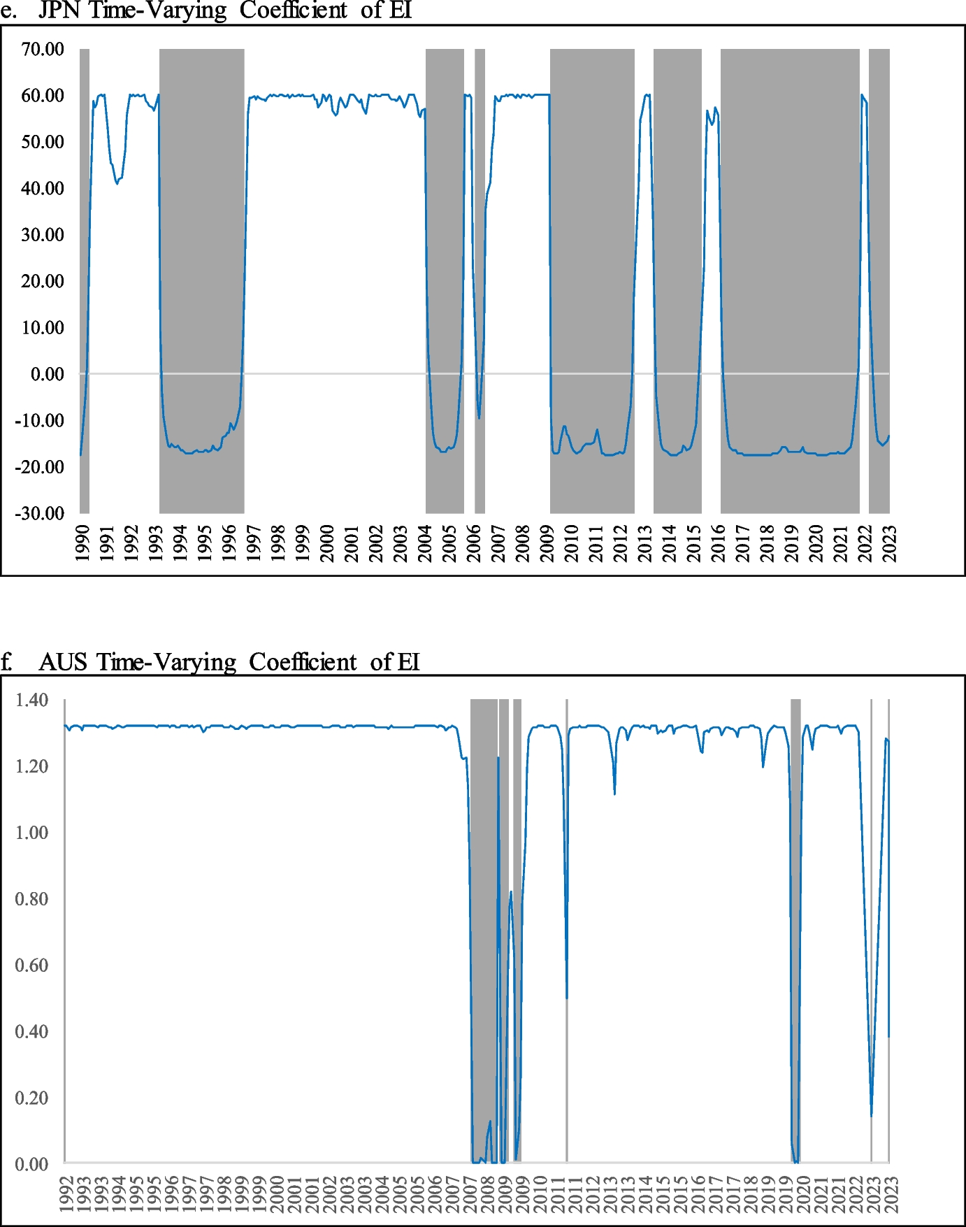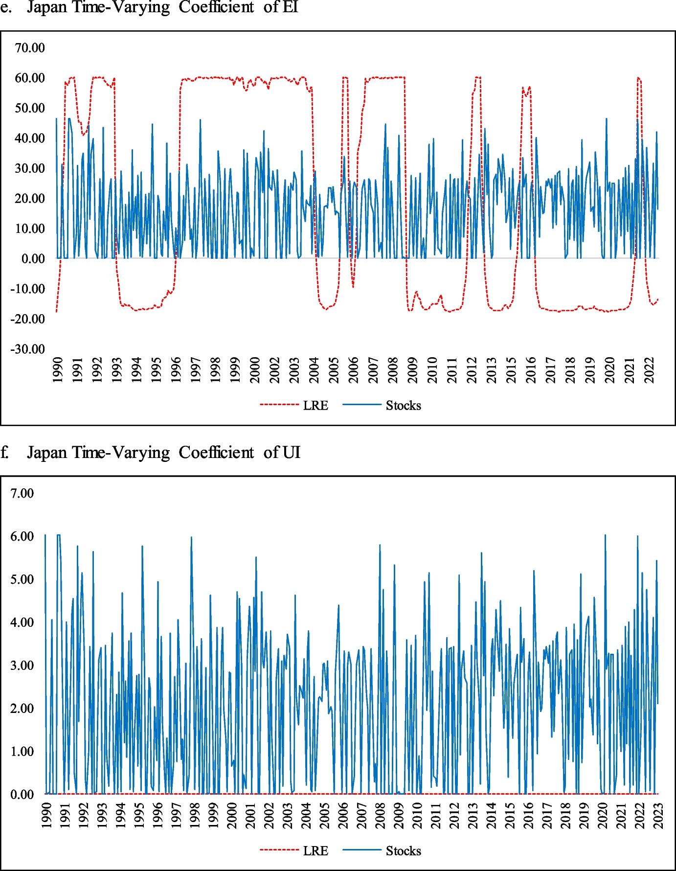 The large coefficient in Japan is caused by the low standard deviation of expected inflation in that country. If we use economic interpretation by multiplying the coefficient with the standard deviation of the variable, we can conclude that a one standard deviation increase in expected inflation leads to an increase in LRE returns by 0.868 standard deviation.
