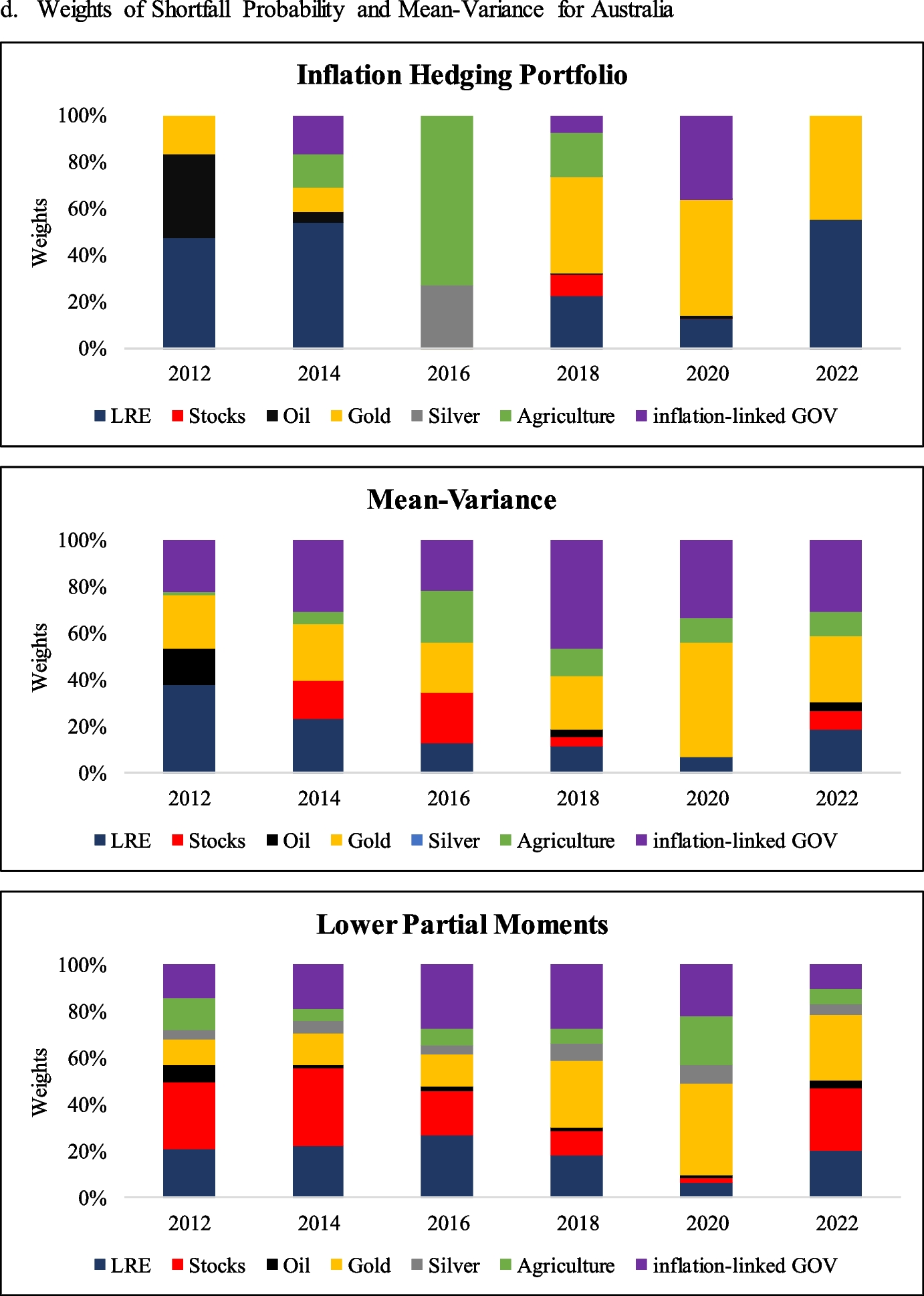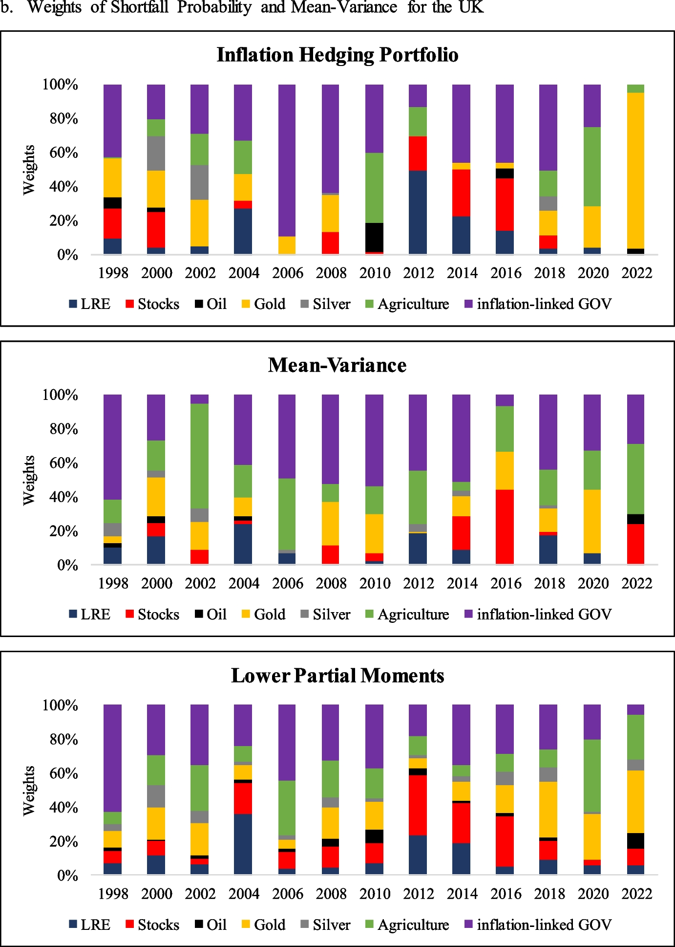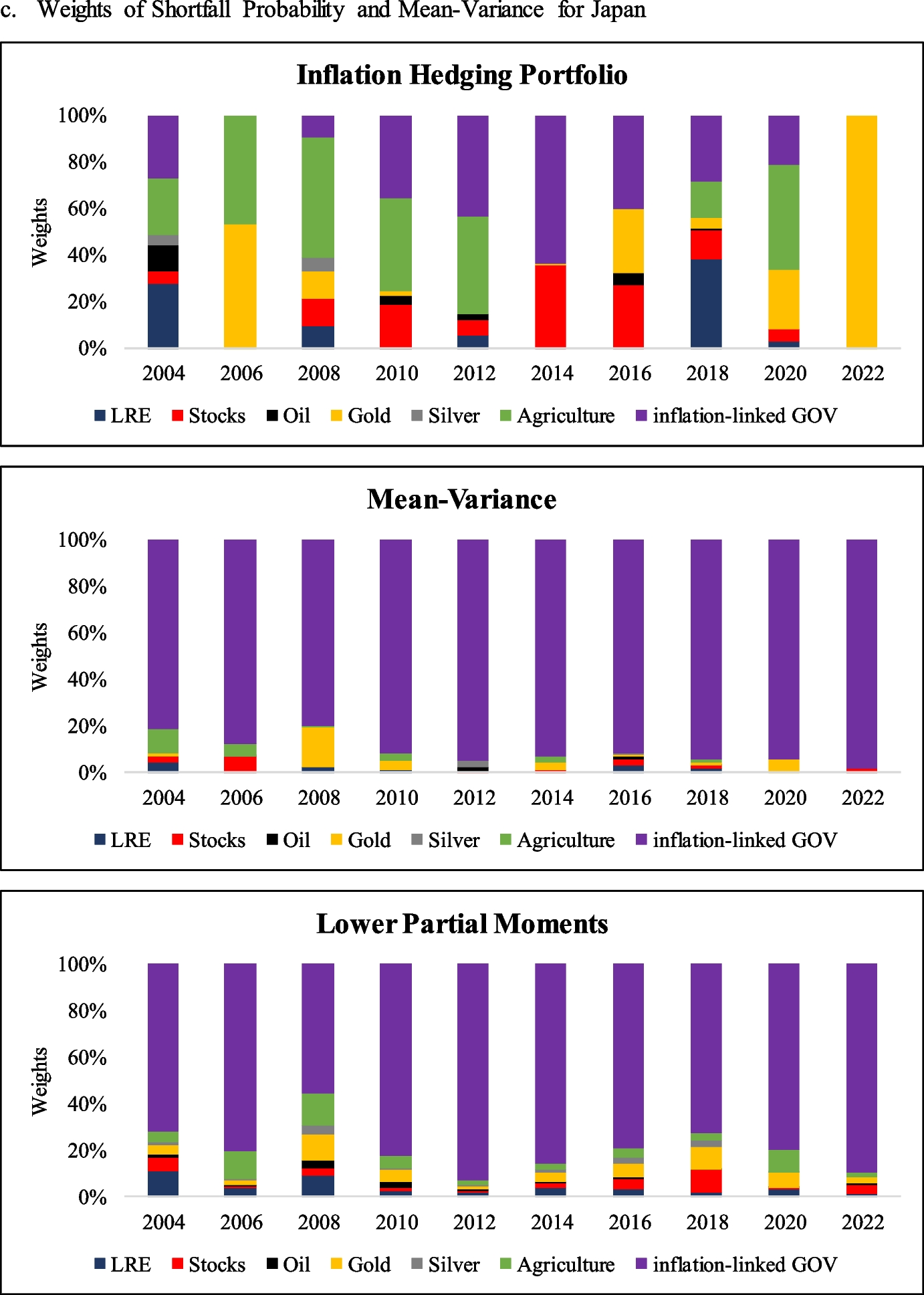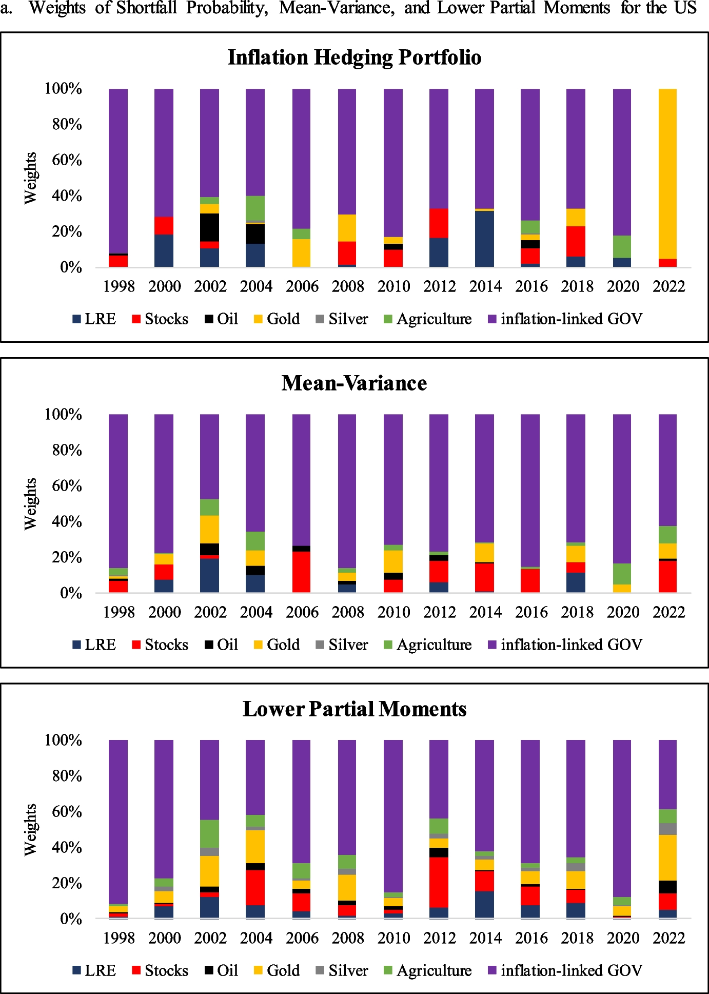 Finally, we demonstrate that LRE can play a significant role in the inflation-hedging portfolio of an investor, even when inflation-linked government bonds are included. The average allocations to LRE for the US, UK, Australia, and Japan over the entire period are 8.32%, 10.87%, 32.15%, and 8.55%, respectively. Those weights are higher than those in the mean–variance portfolio for all countries and higher than those in lower partial moment portfolios for the US, Japan, and Australia. The inflation-hedging portfolio also provides a higher risk-adjusted return than when the mean–variance approach is implemented for the US and Japan.