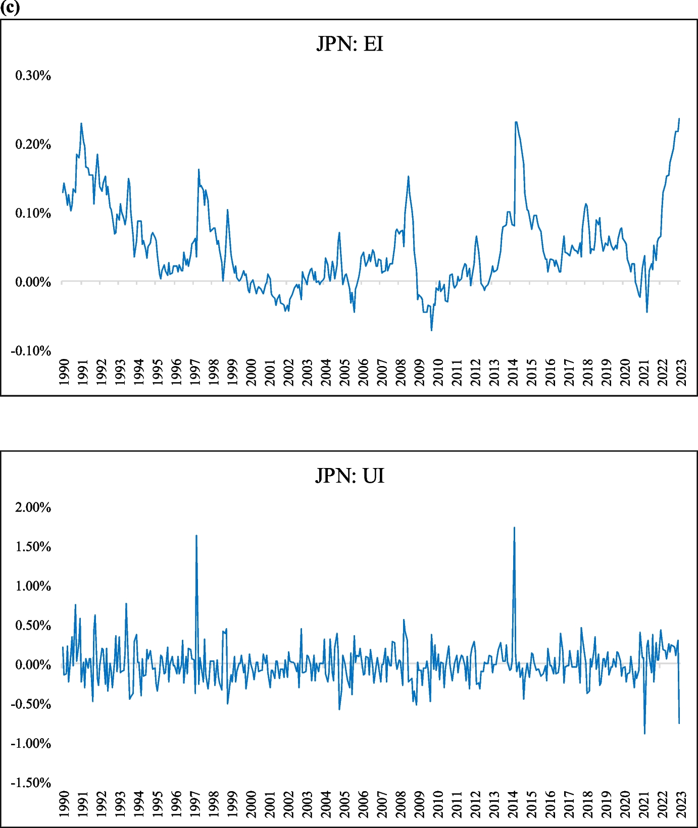 Table 1 displays the corresponding summary statistics of our data. The highest average total return is recorded in the US with 10.64% annually, while Australia, the UK, and Japan follow with annual rates of 8.01%, 4.05%, and 1.31%, respectively. The US faces the highest average expected inflation rate of 1.12% per month, while Japan comes across with the lowest rate of 0.05% per month. In the US, the average monthly unexpected inflation rate is -0.007%, while Japan underwent a rate of monthly unexpected inflation of -0.005%.