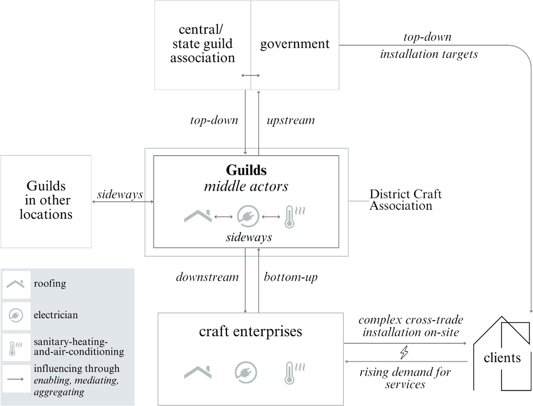 Middle actors are active and pre-existing stakeholders in a system with their own critical agency and capacity to facilitate and impede change in their sphere of influence. They often have long historical roots and, thus, are not established for facilitating transitions but have their independent reason for existence and agenda. These characteristics differentiate them from intermediaries which are more widely studied in transition and innovation research (Parag & Janda, 2014). Guilds, as presented above, thus appear to exhibit distinctive characteristics of middle actors.