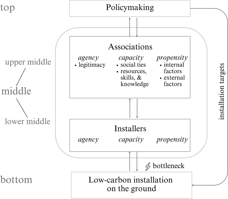 This paper bears three main contributions to the MOP (see Fig. 3): first, it expands the ‘space of the middle’ to guilds as associations of ‘low-carbon installers’ and pivotal ‘upper middle’ actors in the system of low-carbon installations. Second, it specifies the MOP qualities of agency and capacity for their application to guilds or associations more broadly. Third, it proposes propensity besides agency and capacity as the third quality of change agents in the MOP. Thereby it also adds to the reflection on “degrees of middle actors” and their contextual suitability as change agents.