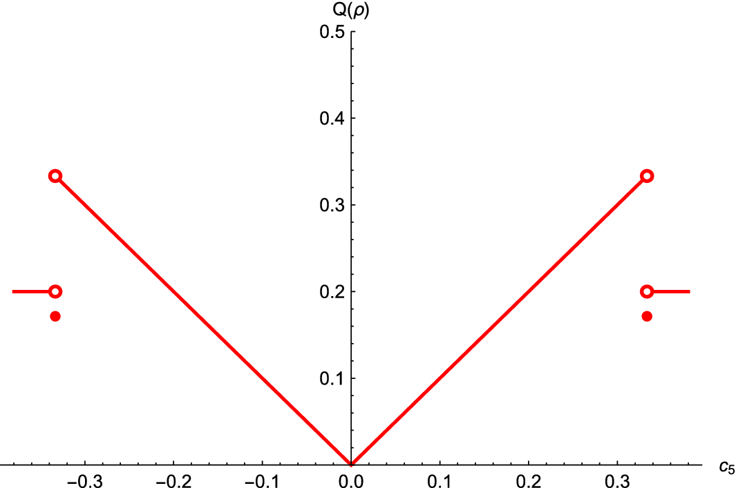 Let us note that the classical correlations given by Eq. (23) are continuous because the second strategy always provides continuous measures of quantum correlations [28]. Remarkably, it is not the case for the quantum correlations given by Eqs. (22). As an illustrative example, let us consider two-qubit X states with \(c_{1} = 1/5\), \(c_{2} = 0\), \(c_{3} = 0\), \(c_{4} = 3/5\) and \(-(2\sqrt{6} - 3)/5 \le c_{5} \le (2\sqrt{6} - 3)/5\). For this one-parameter class of X states the following cases occur: